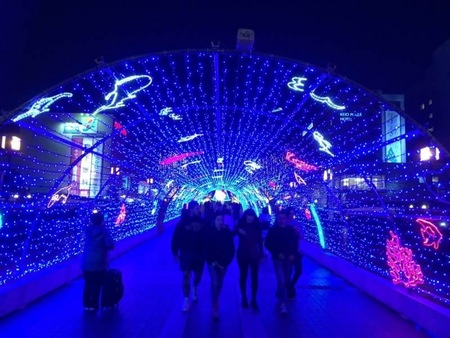 中央に巨大ツリーがあり、ツリーまでの道は青い電飾のトンネルがありました!