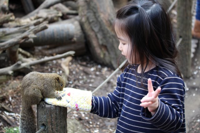 そしてリスにもエサやり体験。リスは放し飼いなので人間に上ってきたりします。
