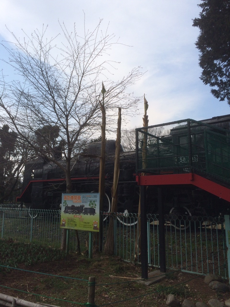 園内を歩き回っているとちょっとした広場にでました。そこにはなんと蒸気機関車が展示