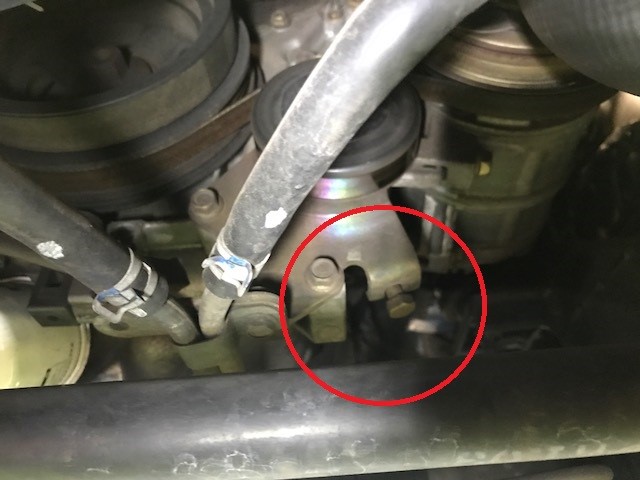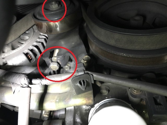 〇印が調整のボルトです。プーリーの真ん中のナットを緩めて調整します。
