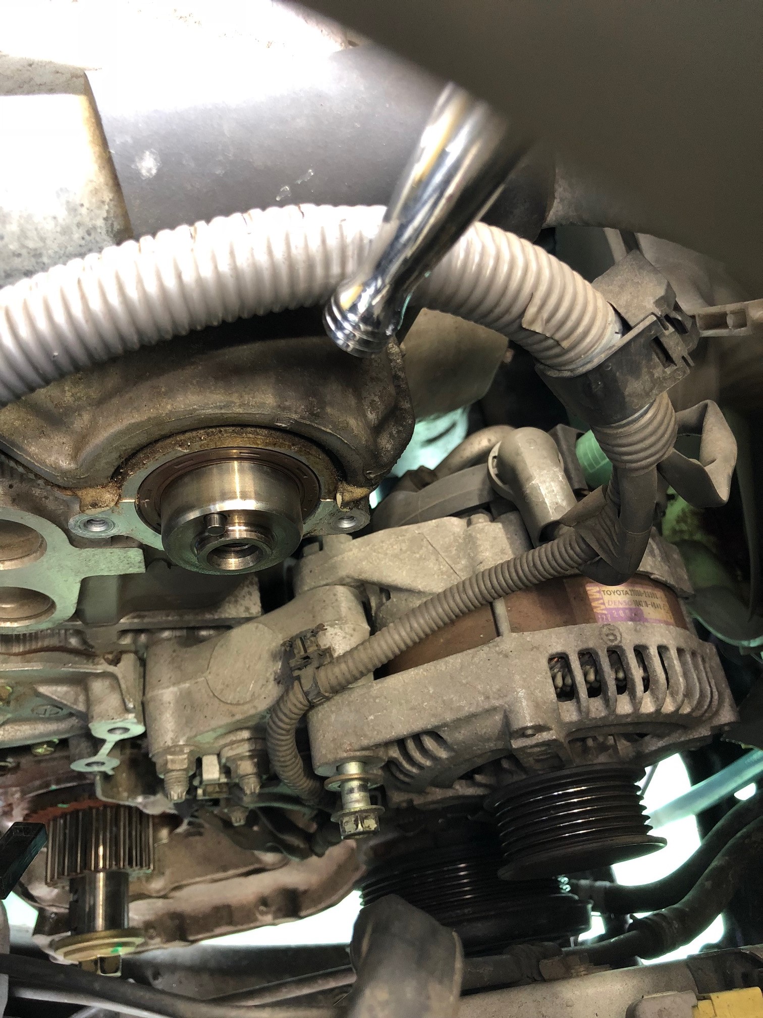 そして補器ベルトを取り外して、エンジンマウントステーなどを外すとタイミングベルトカバーが外れます。