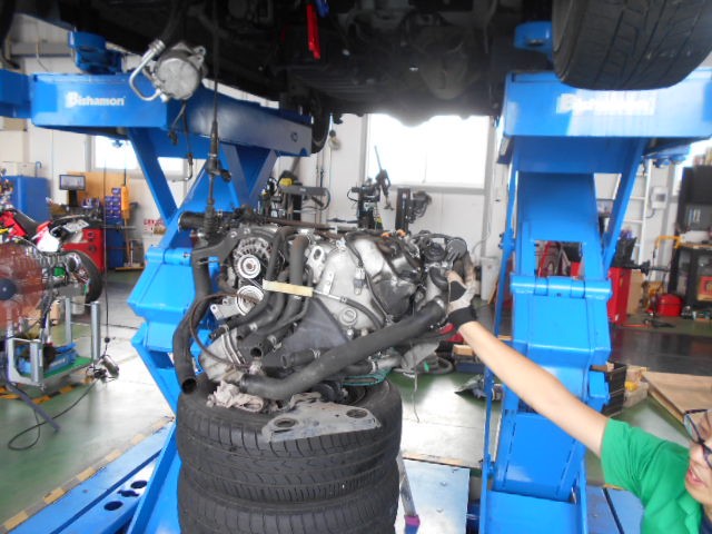 リビルトエンジンをリフトの右側に置いて、左から右へどんどん移植して行きます。