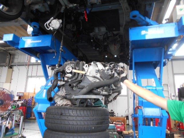 外し終えたら古タイヤを使って、エンジンをミッションごと下に落とします。