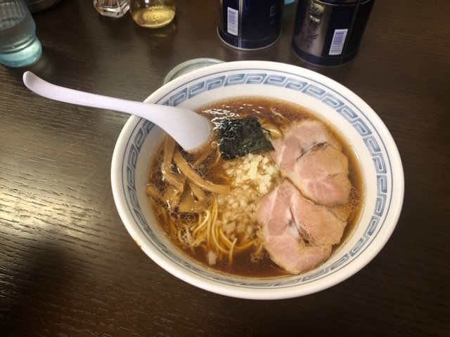 あっさりとした、玉ねぎの乗っている八王子ラーメンです。