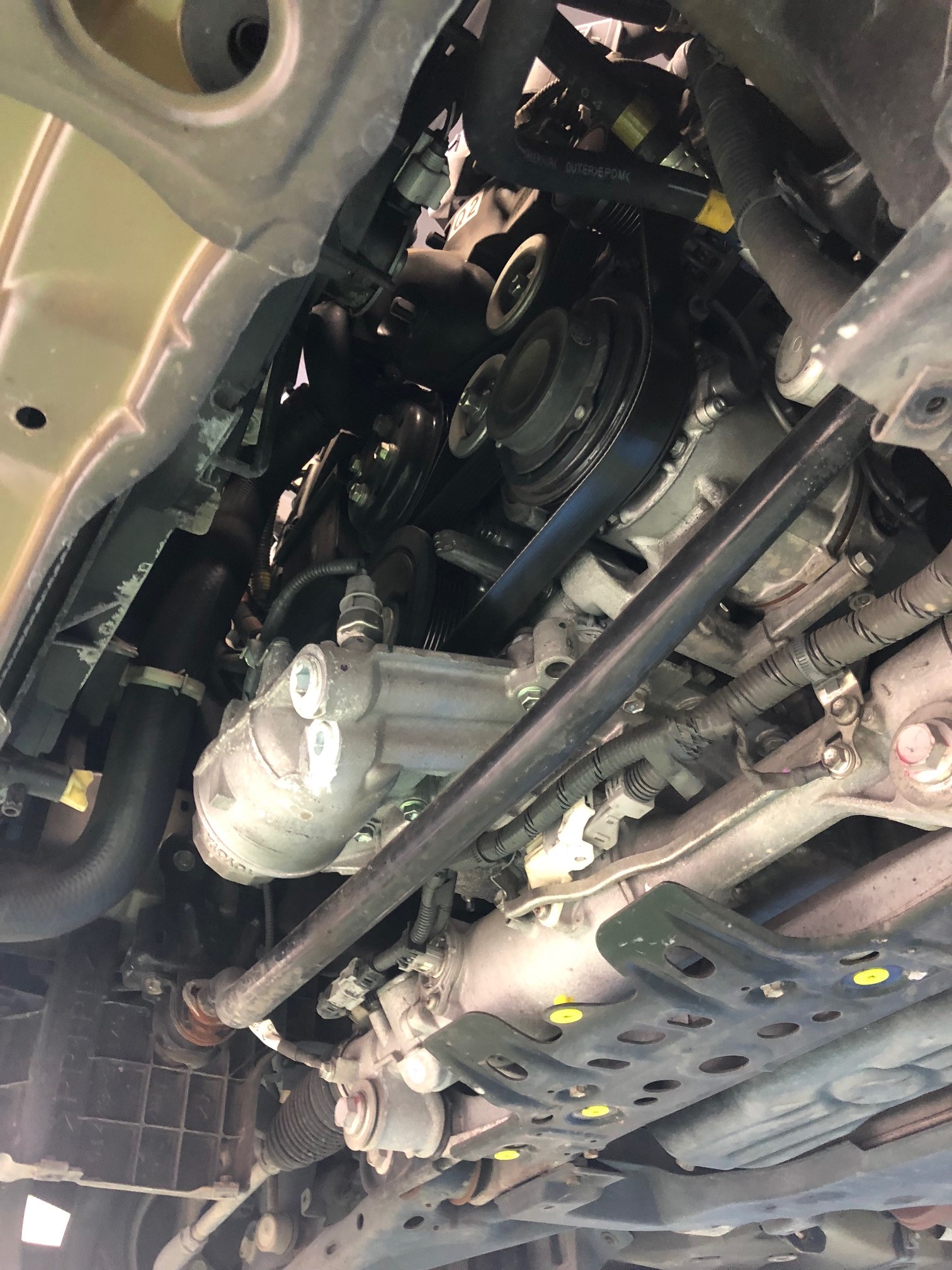 下から覗くとこんな感じです。まずは冷却水を抜いて、ベルトを取り外し。