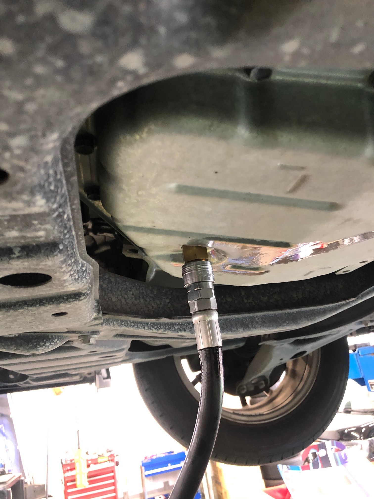 チェックボルトを取り外して専用のアダプターを取り付けてフルードを交換します。