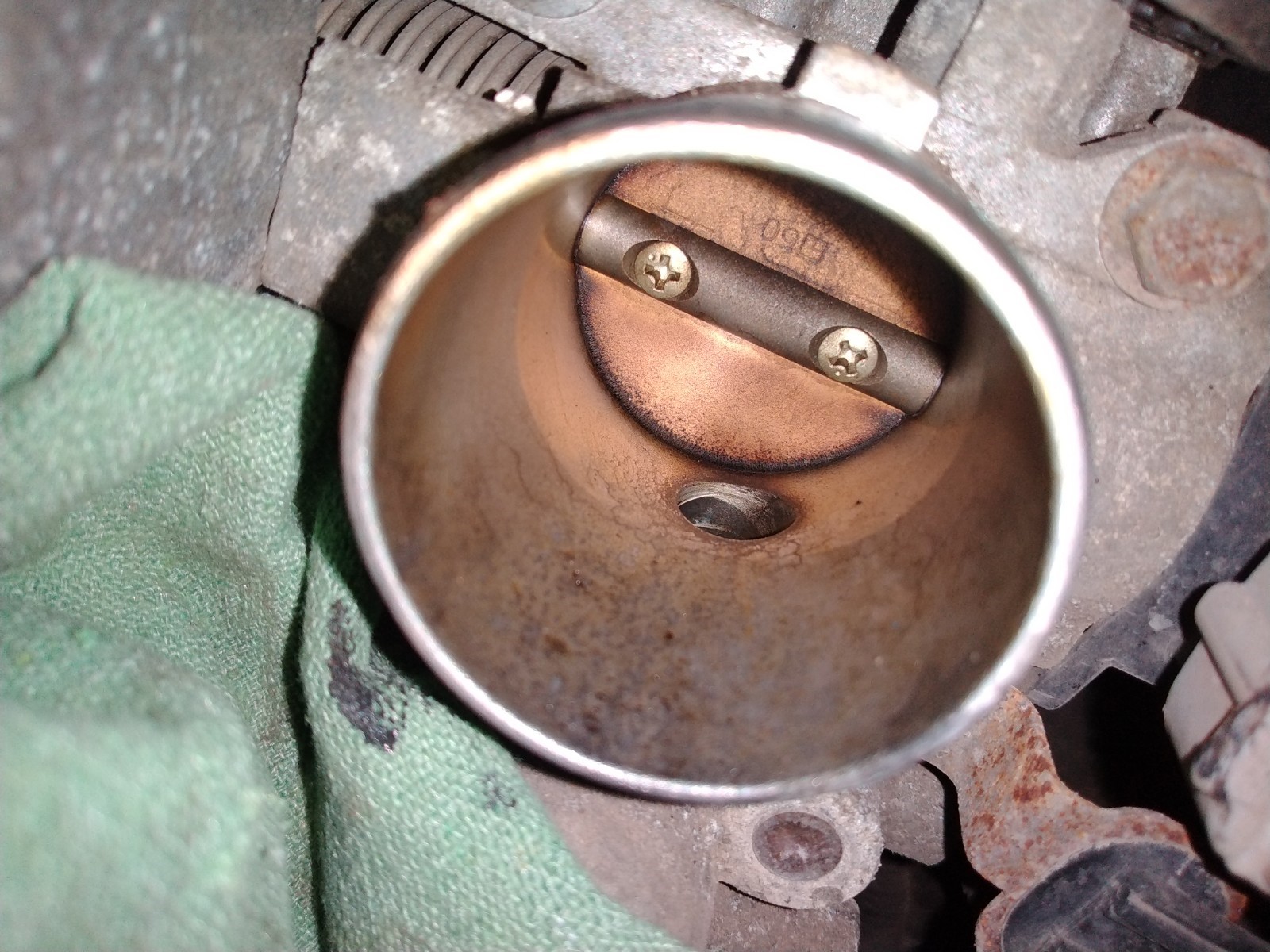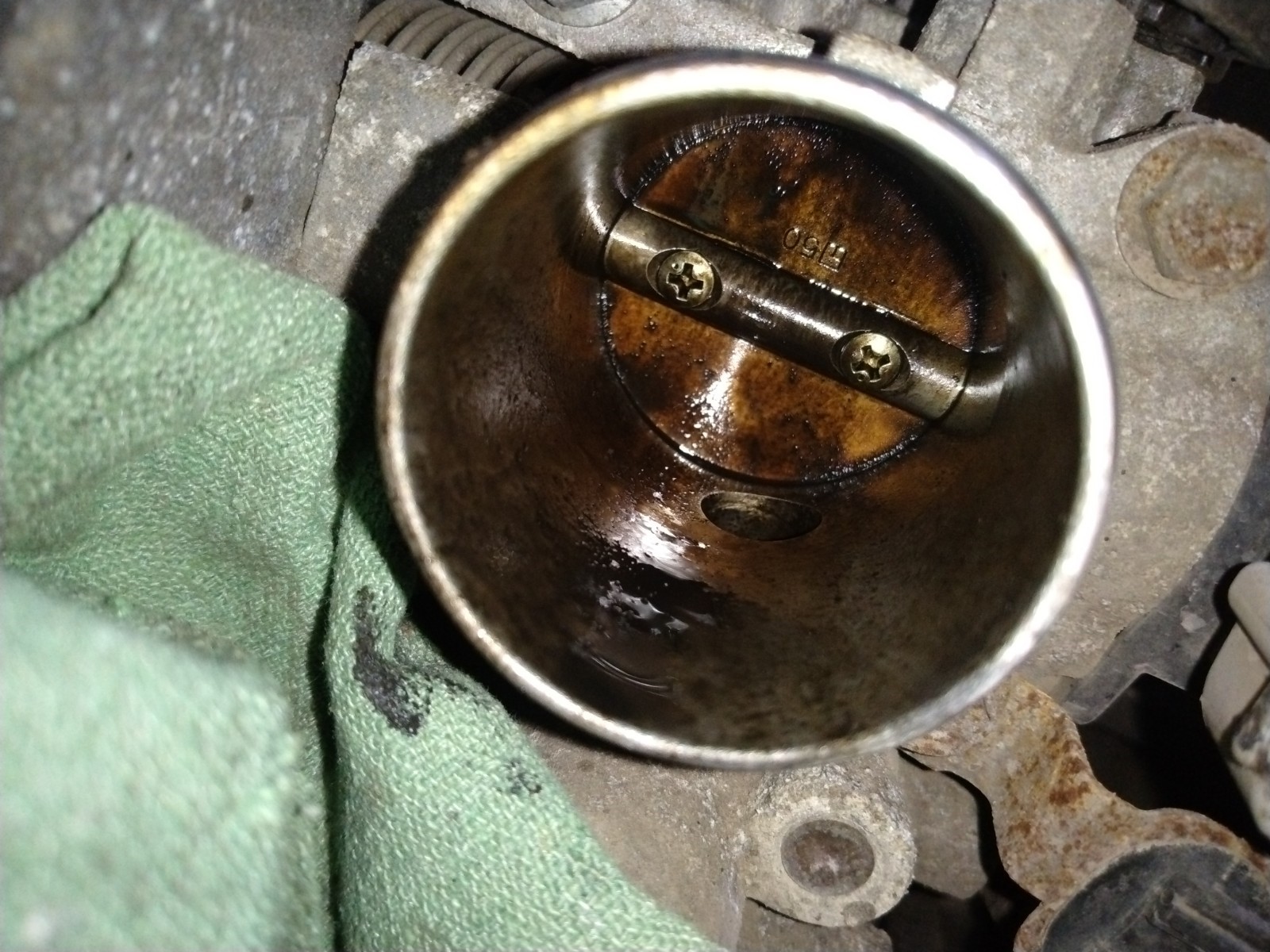 このような状態だったスロットルを洗浄液をかけ洗浄すると