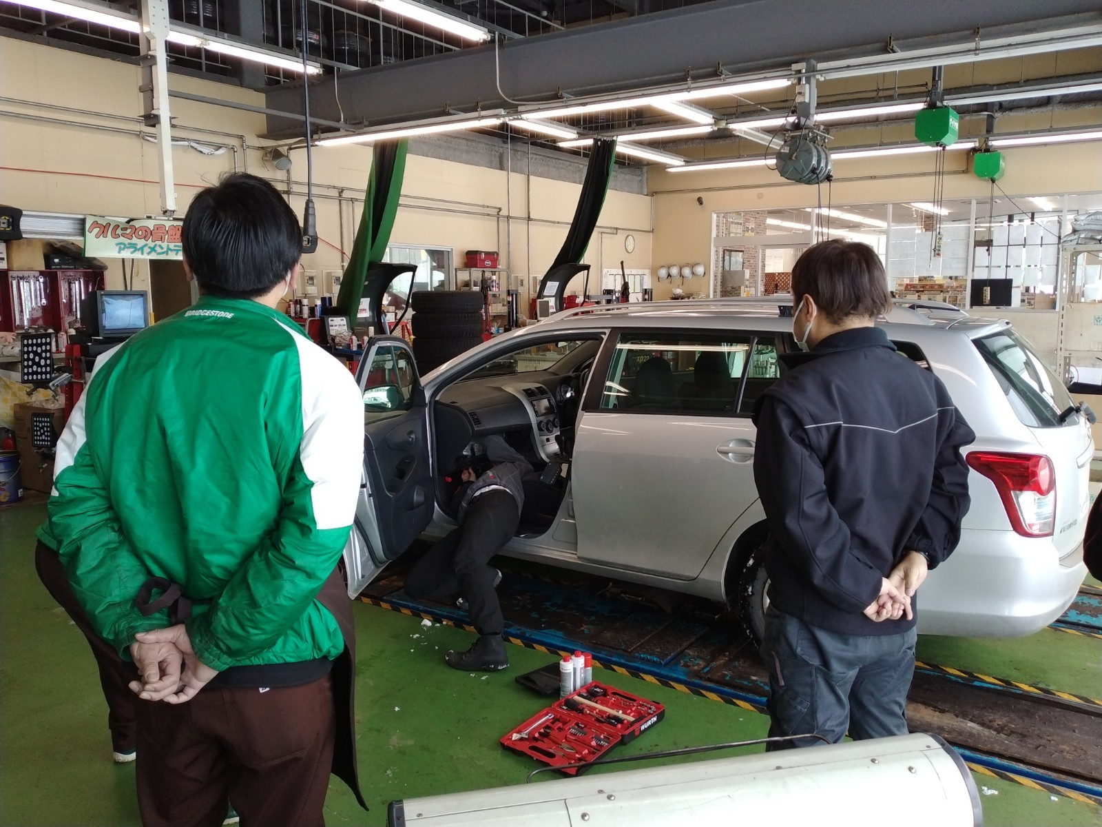 講習に使用した、タイヤ館西野の代車である‶ZNE144”の‶トヨタ カローラフィールダー”ですと、実質作業時間は30~40分程度。