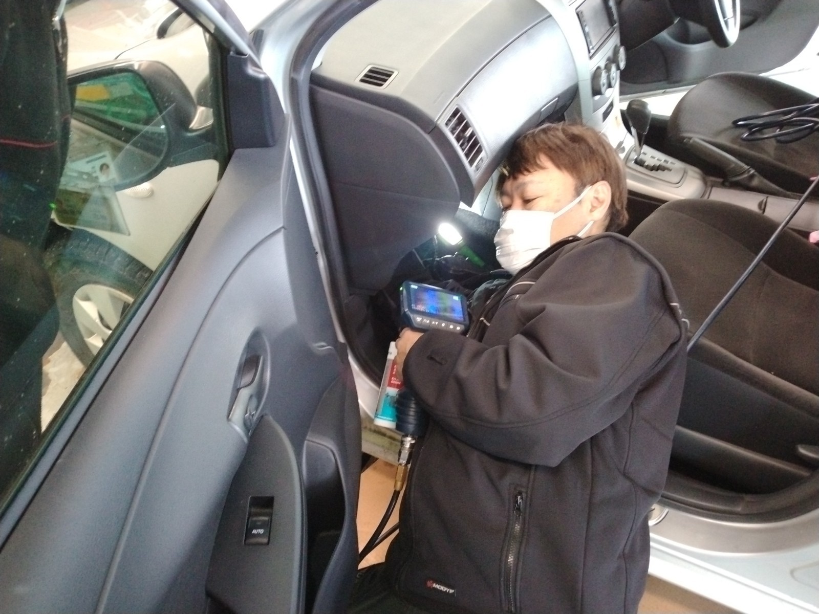 専用の治具を使い、モニターに表示されたエバポレーターの状態を見ながら専用の洗浄液で洗浄、洗浄が終わったら、専用の除菌・消臭剤で仕上げといった工程です。