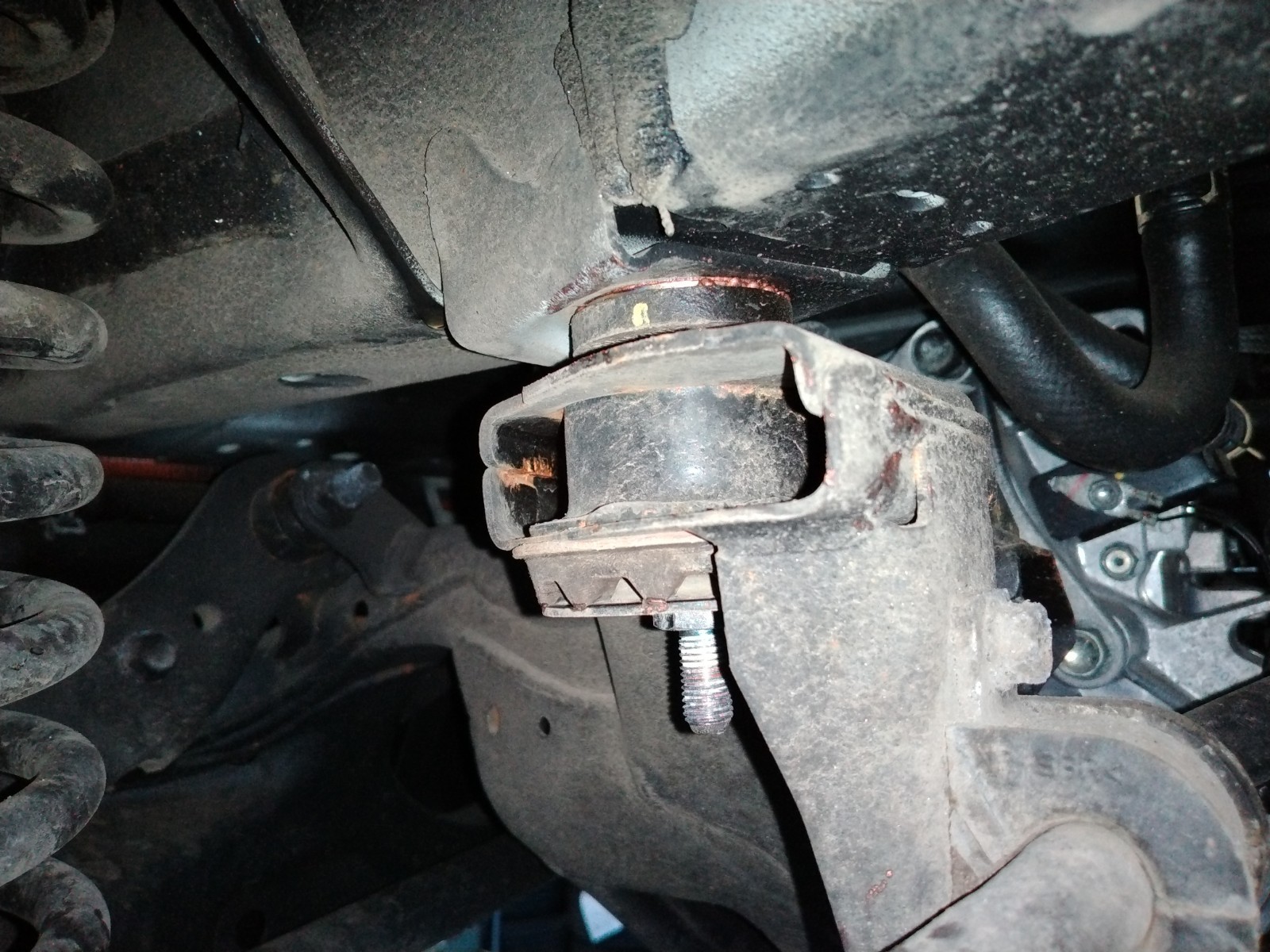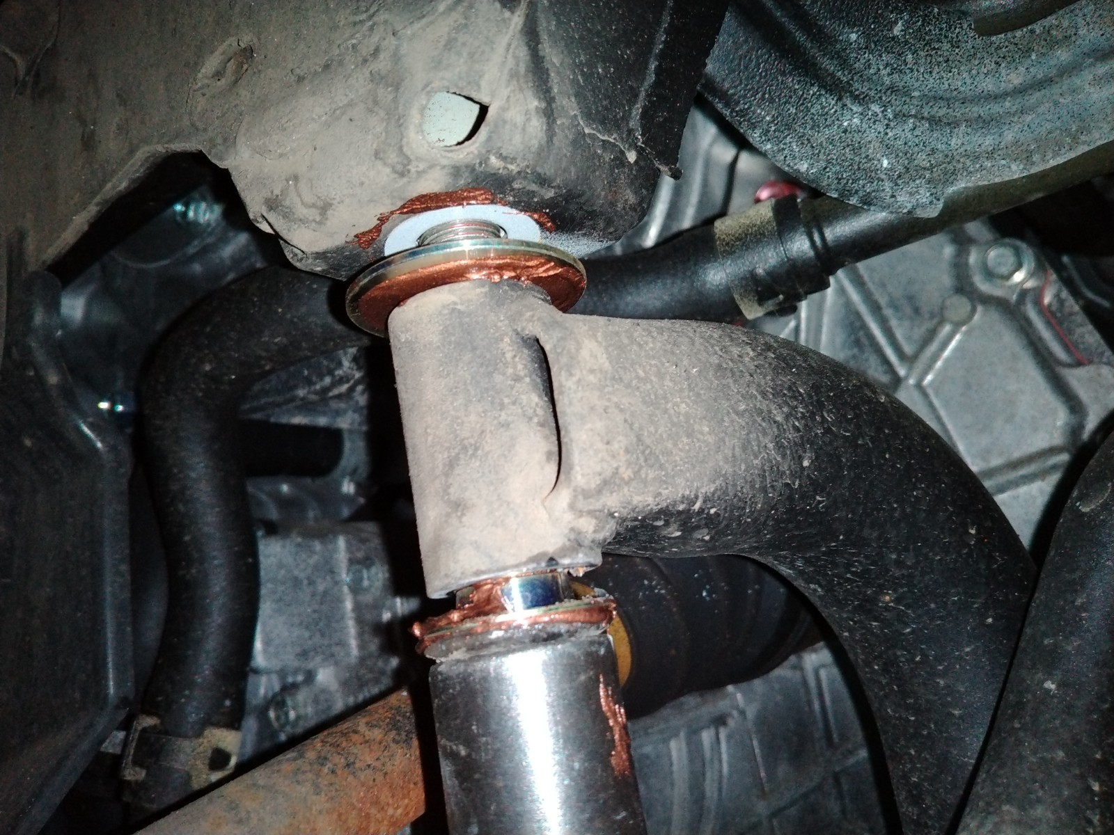 いきなりボルトを外すとメンバーごとエンジンが落ちてくる(/o\)!!ので気を付けつつ各所を緩めていき、一カ所ずつリジカラを入れていきます。