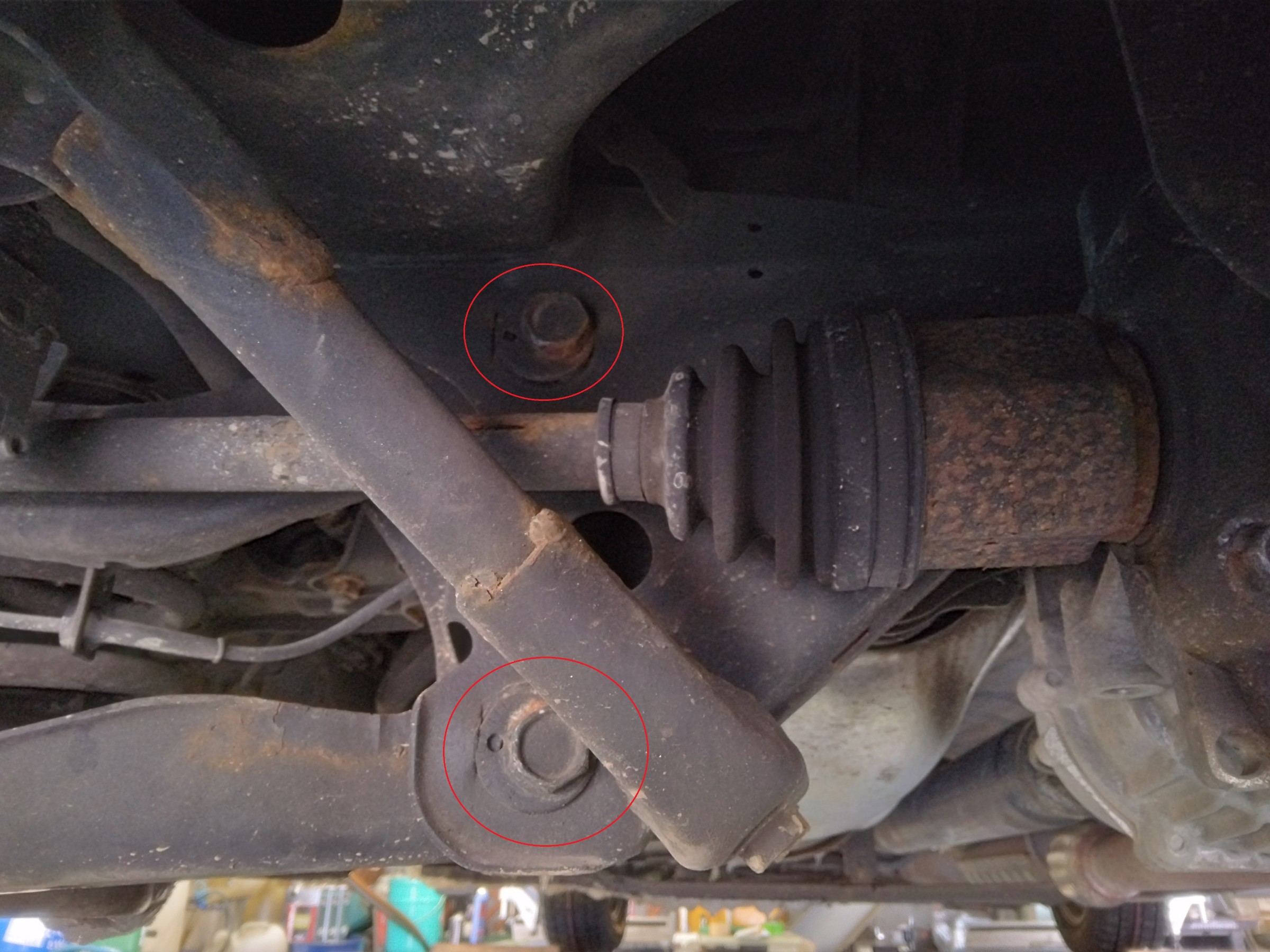 赤まるのボルトを調整してキャンバー・トーを調整するんですが、札幌のクルマの場合5年経ってたらそろそろ動かなくなる可能性が高いですね(>_<)
