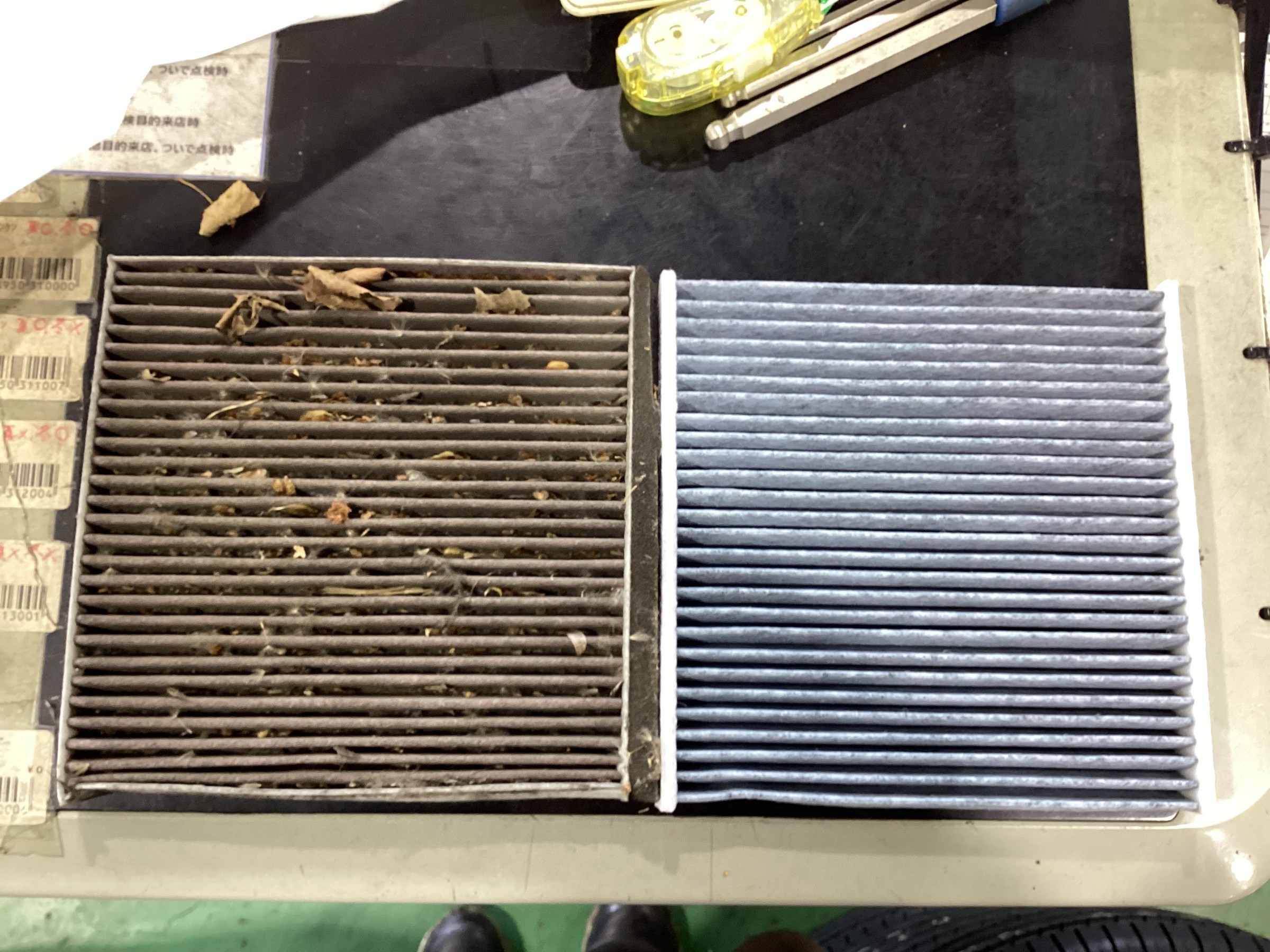 過去には、風量を上げても 「ゴバー!!」 って音がするだけで吹き出し口からそよ風しか出ないおクルマがいらっしゃって 「雨の日に曇りがとれなくて困っている」 と言うことで点検したらフィルターがまるでカーペットのように詰まっているクルマもありました(^^;)