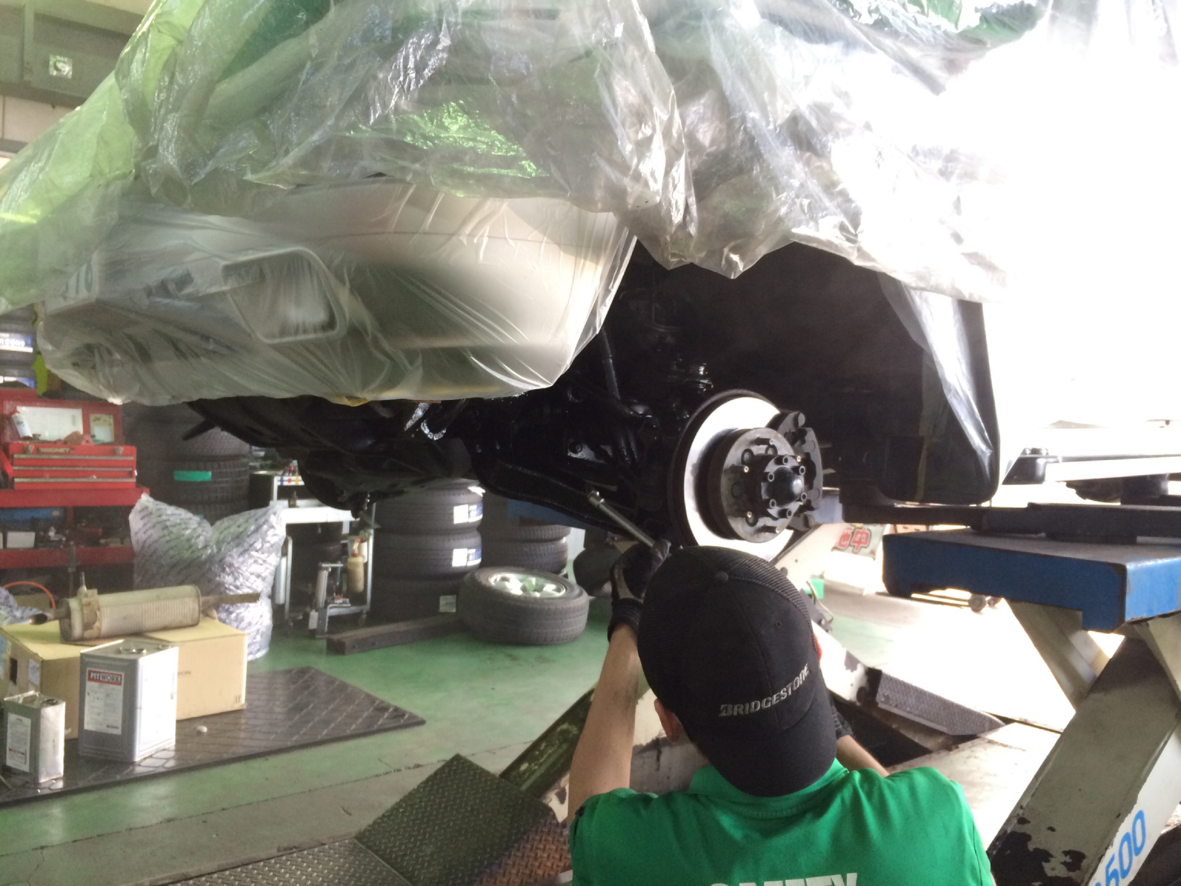 本日は車検でお預かりしたお車の下塗りを保科スタッフが実施中です。