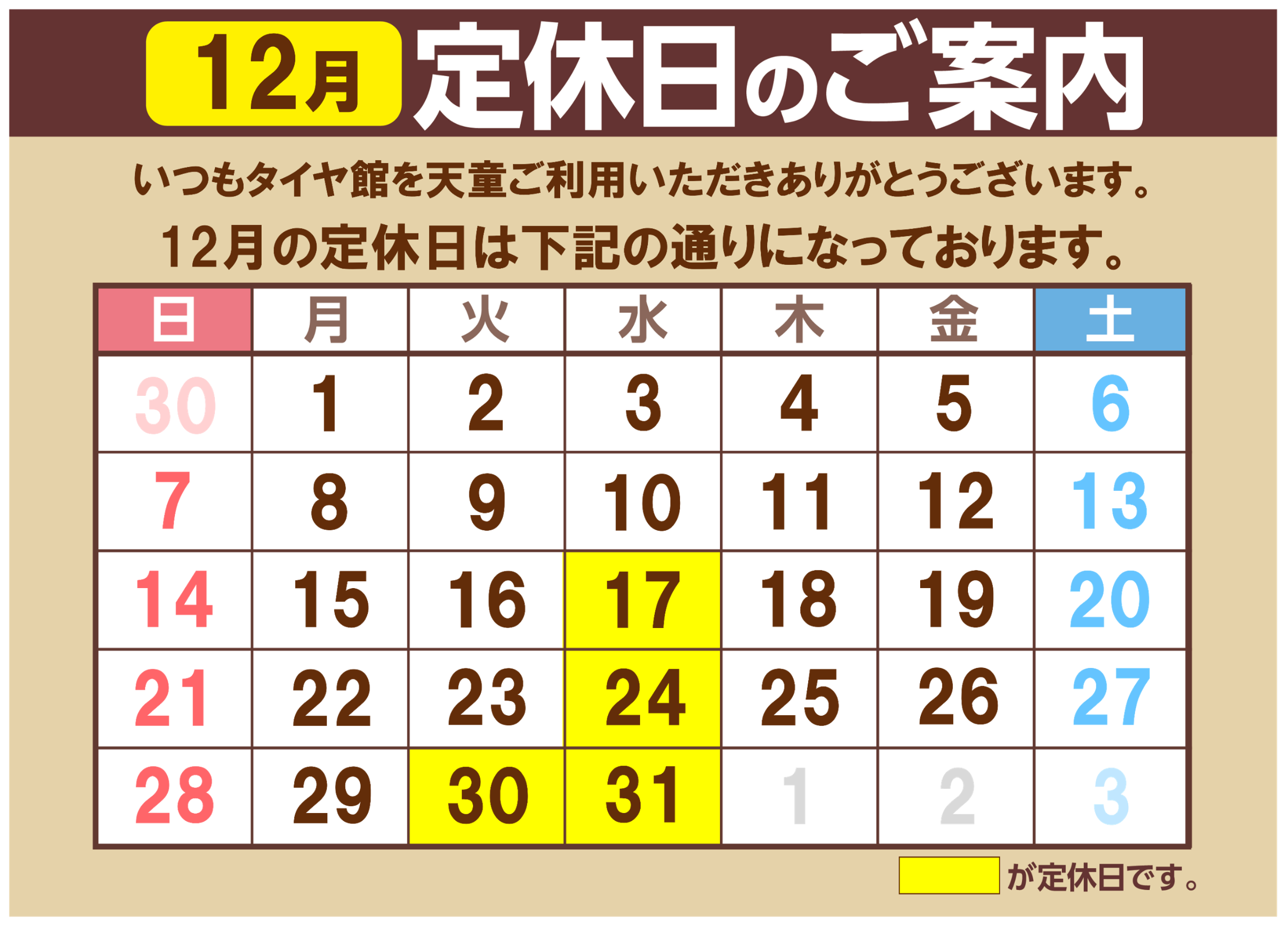 2025年12月営業日のご案内 2025年11月30日 いつもタイヤ館天童をご利用いただき 誠にありがとうございます。 2025年12月営業日 【定休日のご案内】 17日(水)・24日(水)・30日(火)・31日(水) ※水曜日が定休日となります。 ※30日(火)は年末年始となりますのでお休みになります。 今後とも、タイヤ館天童をよろしくお願い致します。