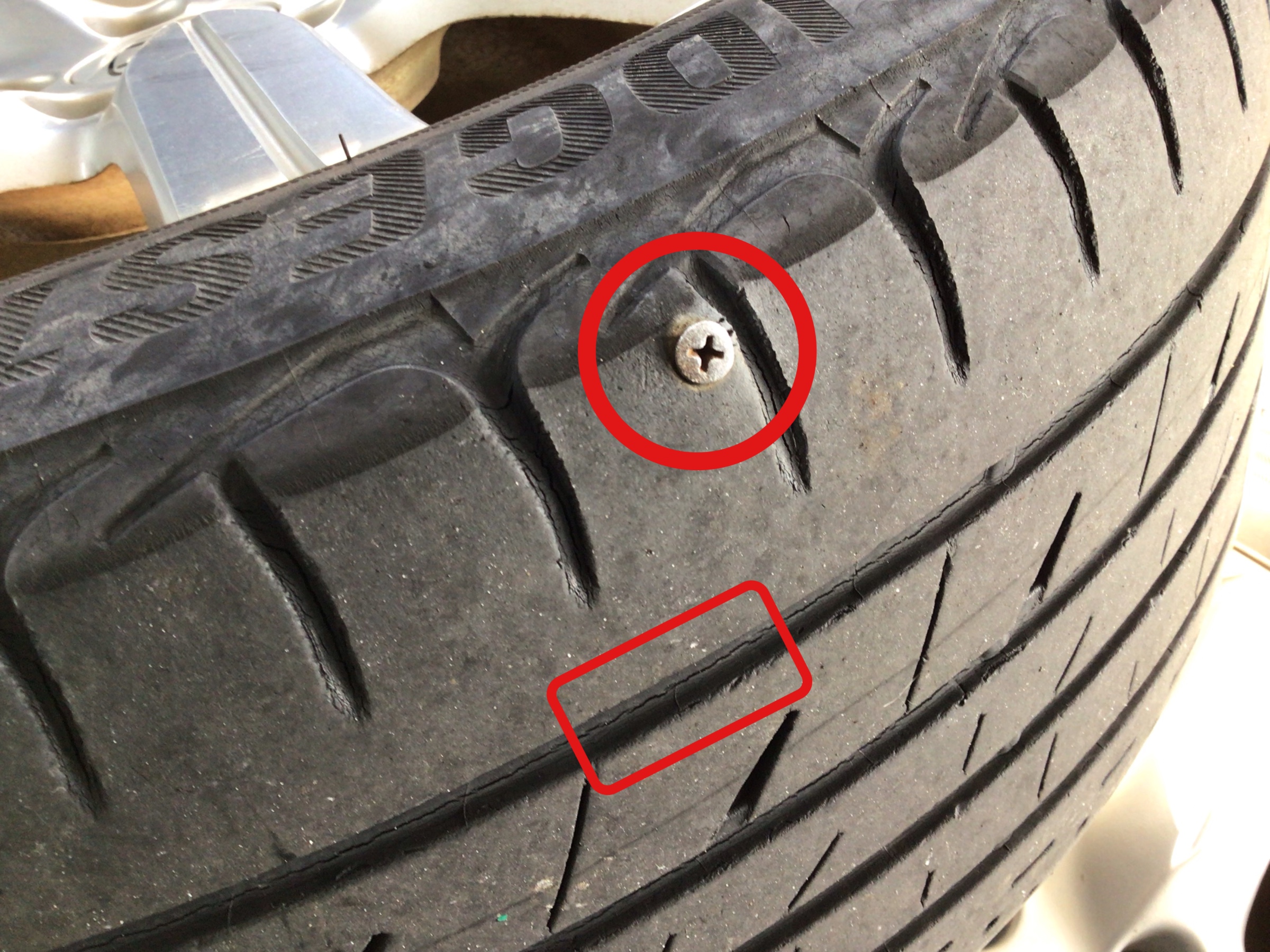 点検するとねじが刺さっていました