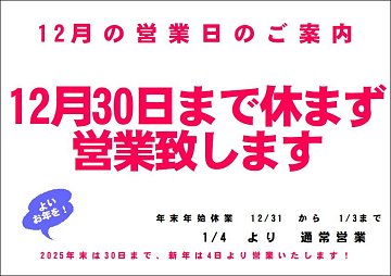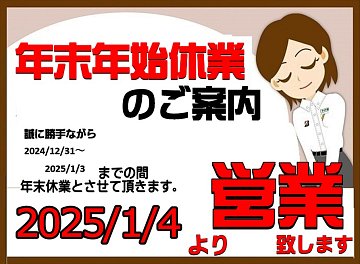 年末年始休業日のお知らせ 今年もたくさんのお客様に御利用いただきまして ありがとうございました! 来年もスタッフ一同元気にお待ちしております! 誠に勝手ながら、弊社の年末年始休業日を下記のとおりとさせていただきます。ご迷惑をおかけいたしますが、なにとぞ、ご了承いただきますよう、お...