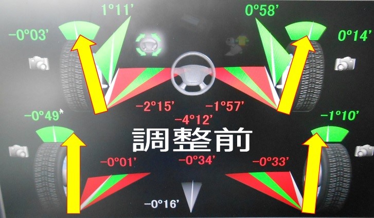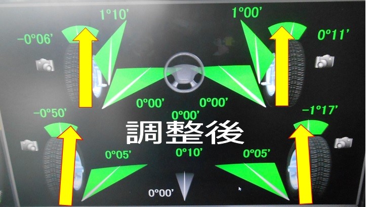 調整後です。基準値のフロント0°00’、リア0°05’に左右合わせました。