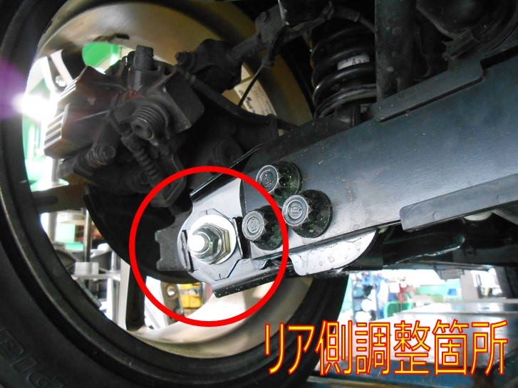 リア側の調整箇所です。赤丸の中のシルバーのネジを緩めて調整します。