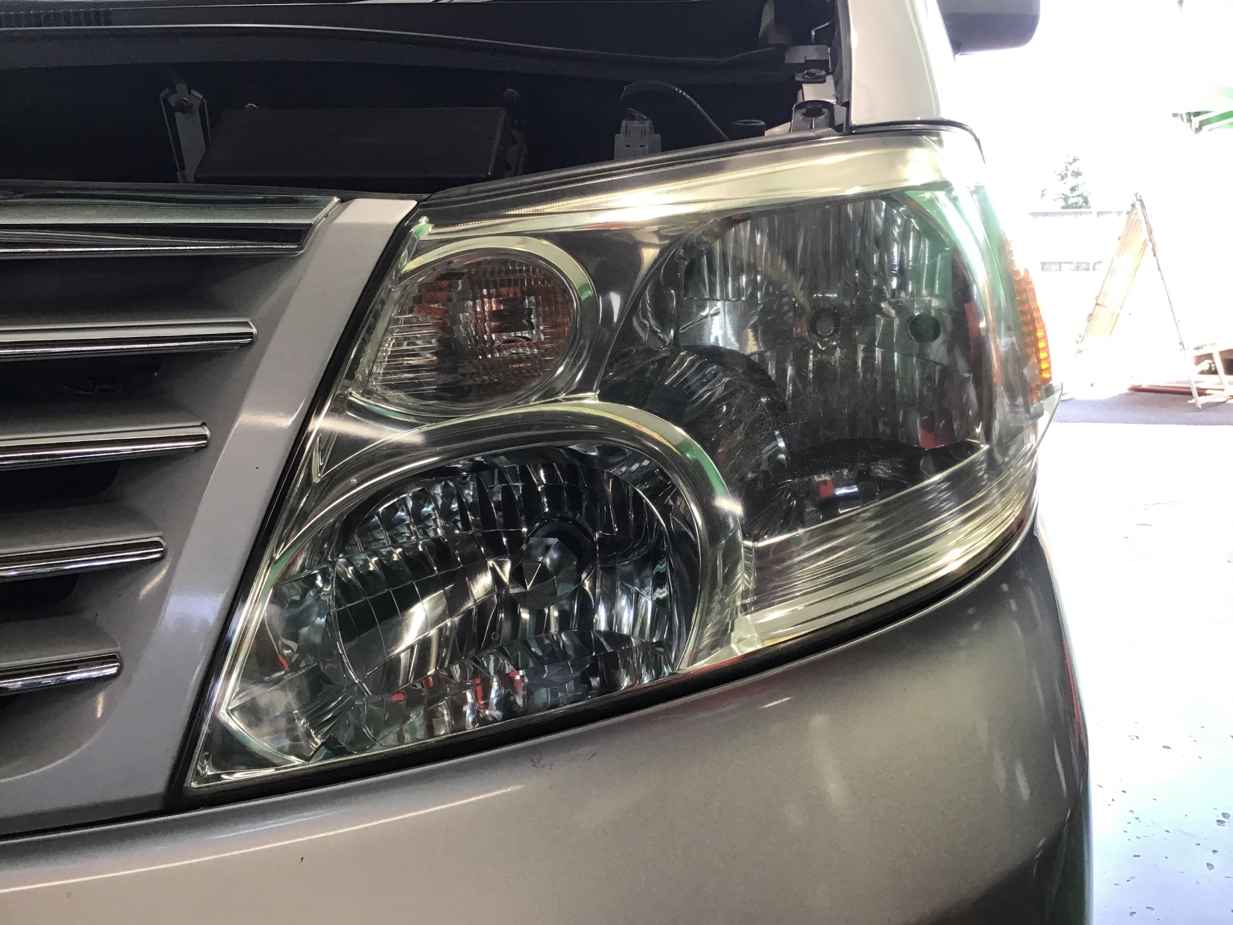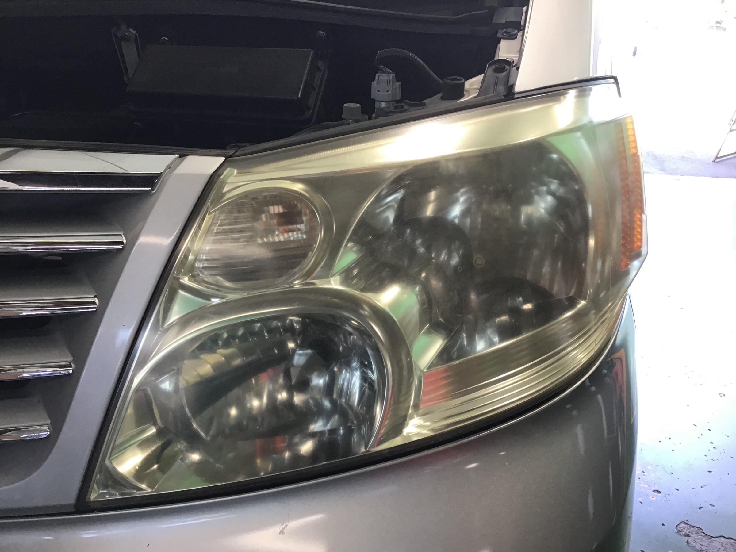 全体的にクスミがあり、ヘッドライトの奥がボヤけて見えます。