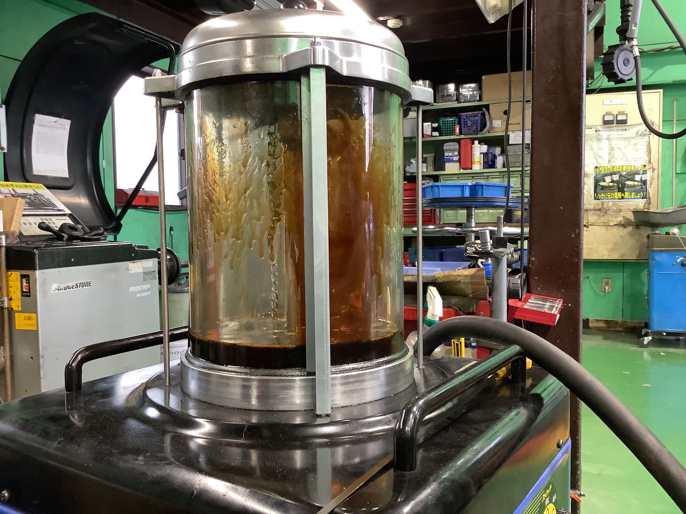 当店のエンジンオイル交換は専用の機械でオイルレベルゲージ部から上抜きします。