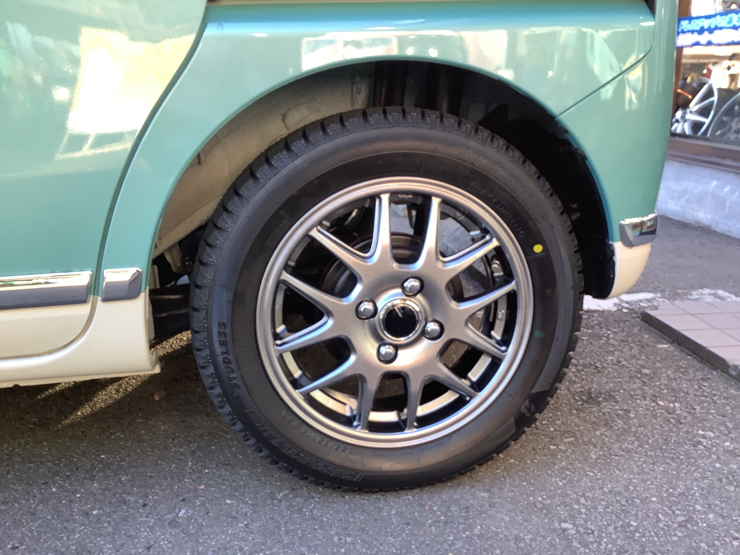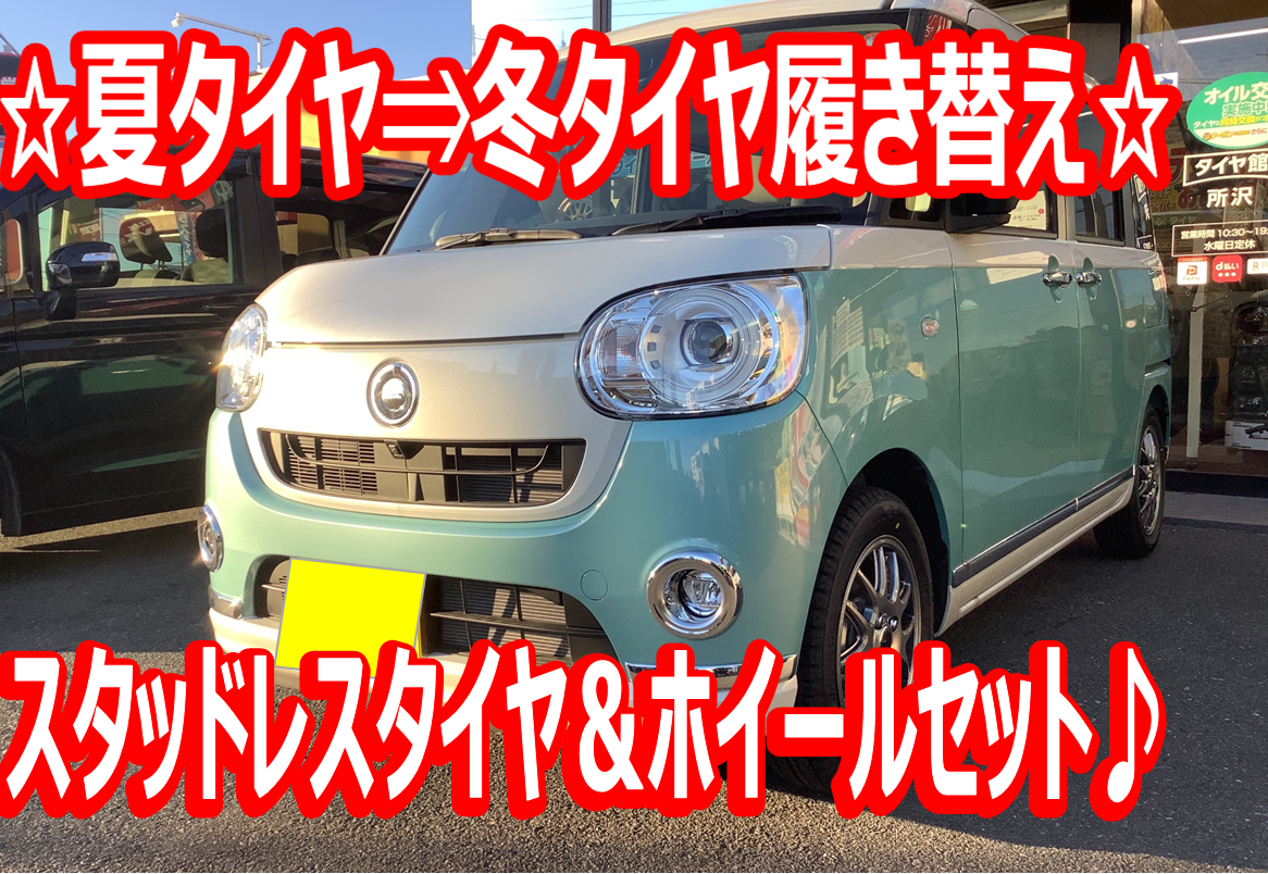 本日はダイハツ・ムーヴキャンバスのスタッドレスタイヤ、アルミホイールセットでの交換のご紹介です(^^)