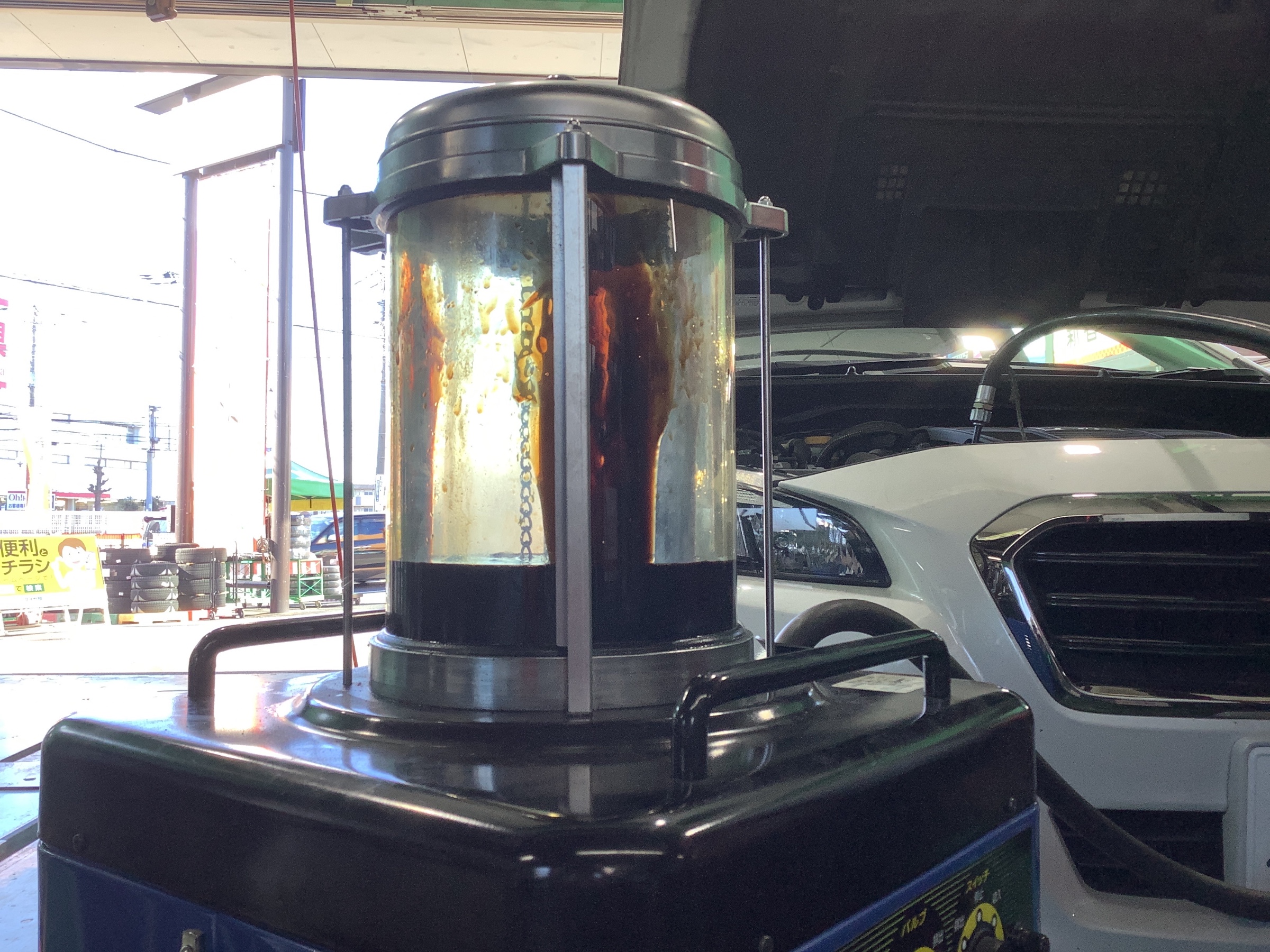 当店のエンジンオイル交換は専用の機械でオイルレベルゲージ部から上抜きします