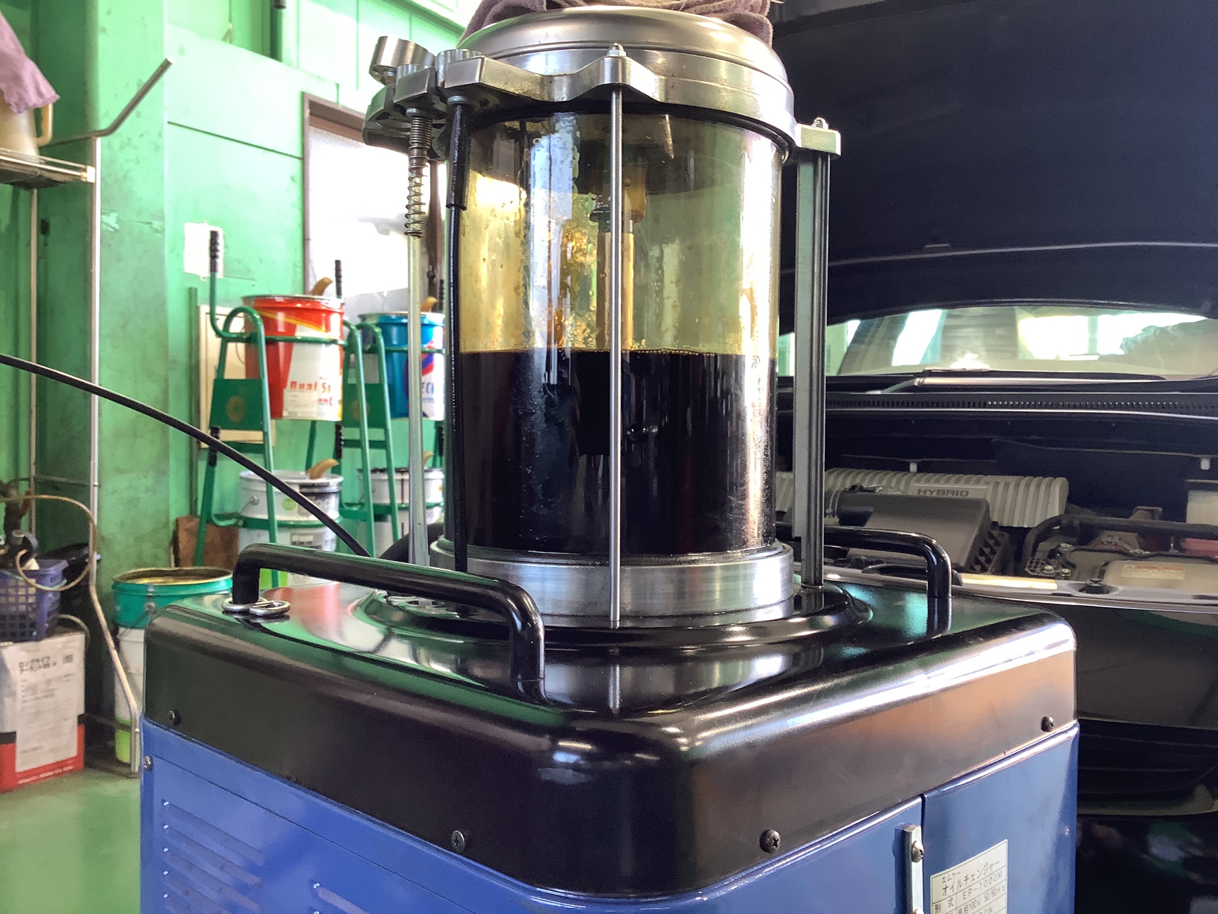 当店のエンジンオイル交換は専用の機械でオイルレベルゲージ部から上抜きします。