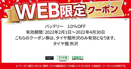 こちらのクーポン券は、タイヤ館所沢のみ有効となります。