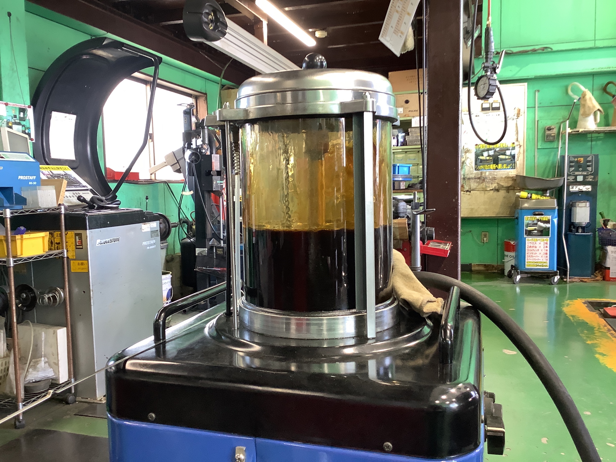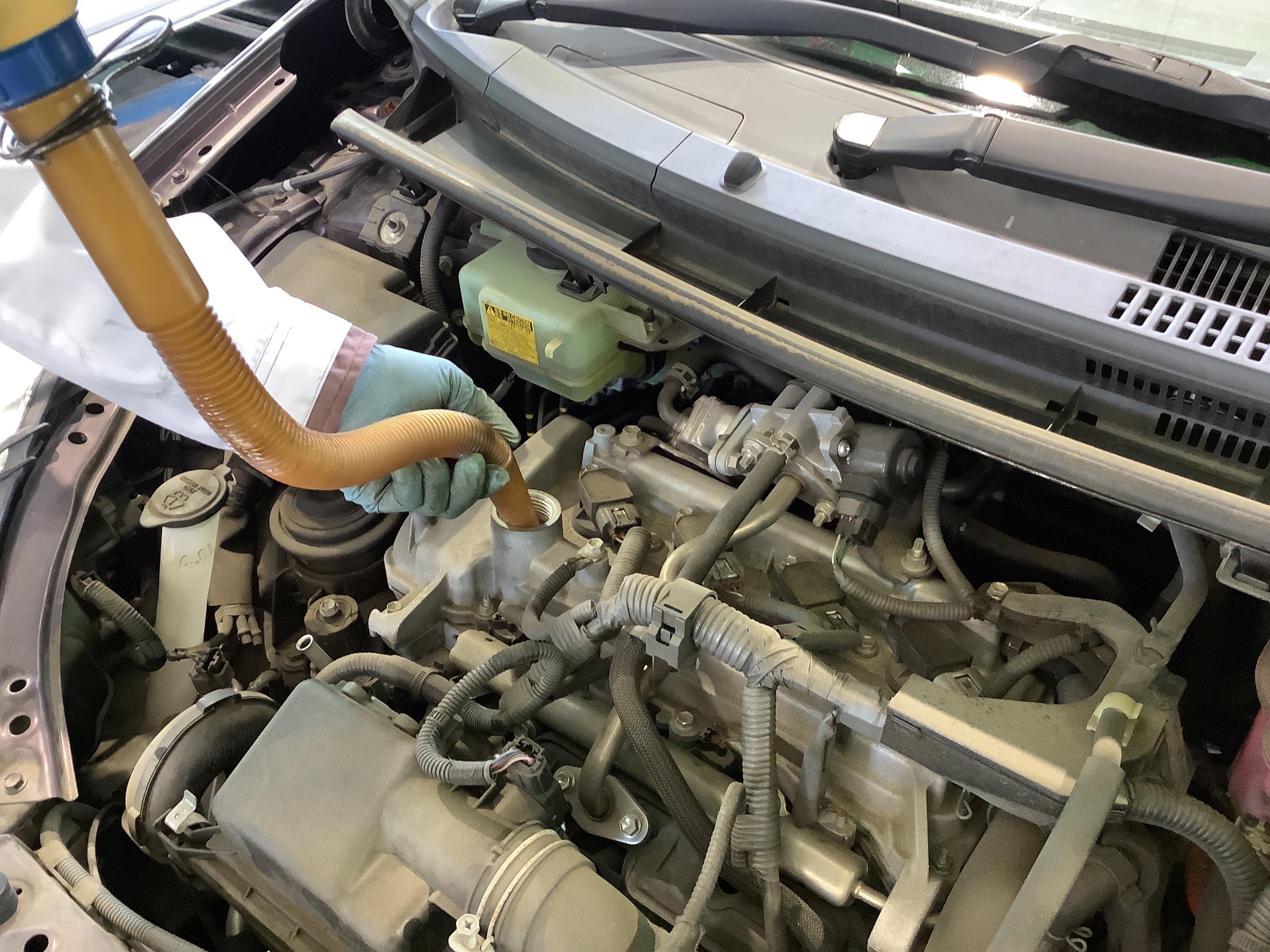 当店のエンジンオイル交換は専用の機械でオイルレベルゲージ部から上抜きします。