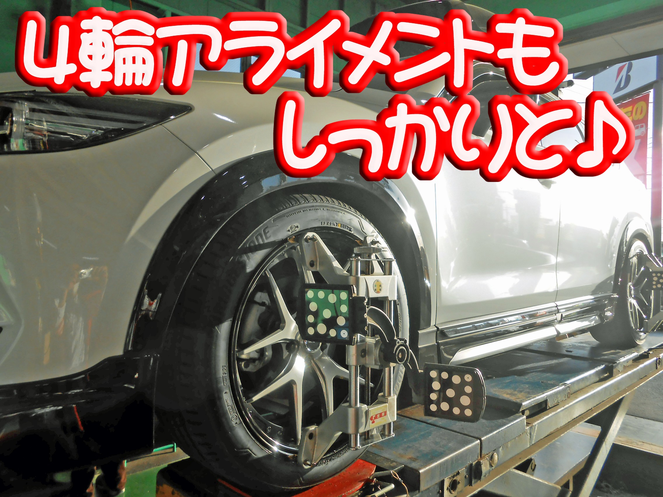 タイヤ交換、アルミホイールのご相談、車高調、ダウンサス、アライメント調整などの