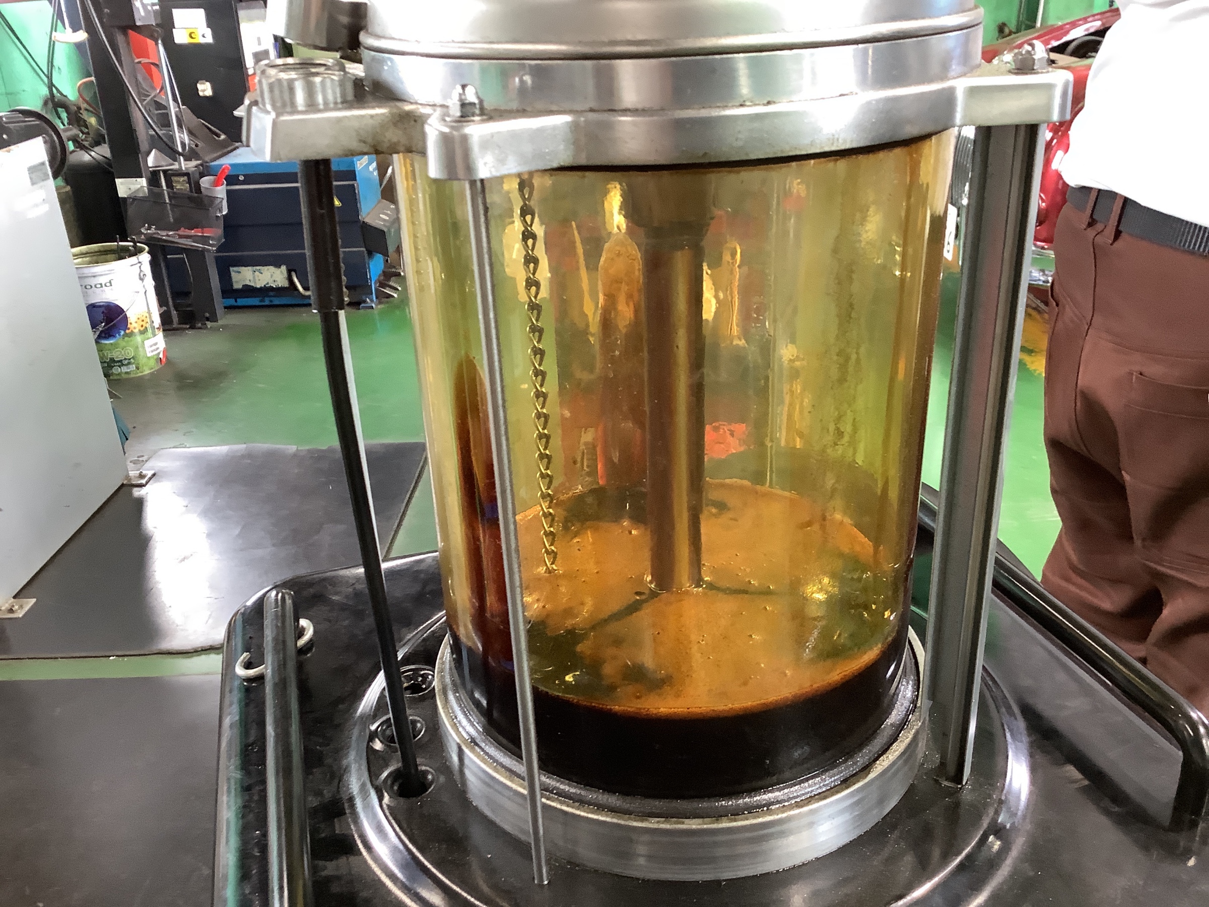 当店のエンジンオイル交換は専用の機械でオイルレベルゲージ部から上抜きします。