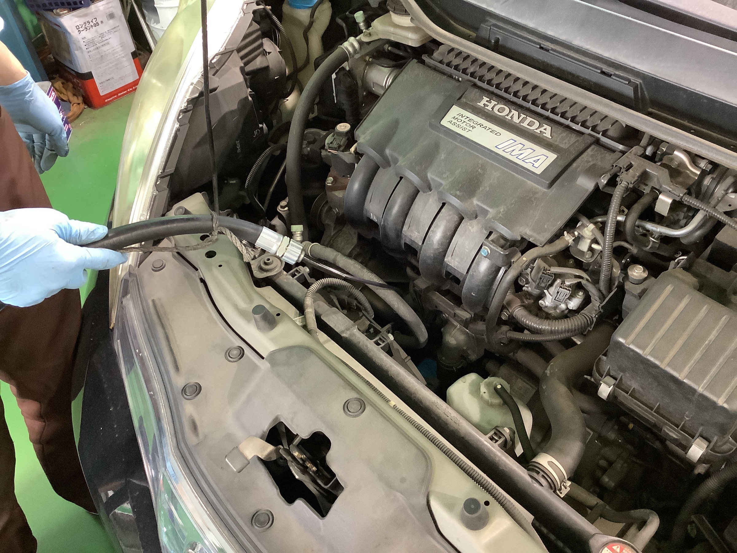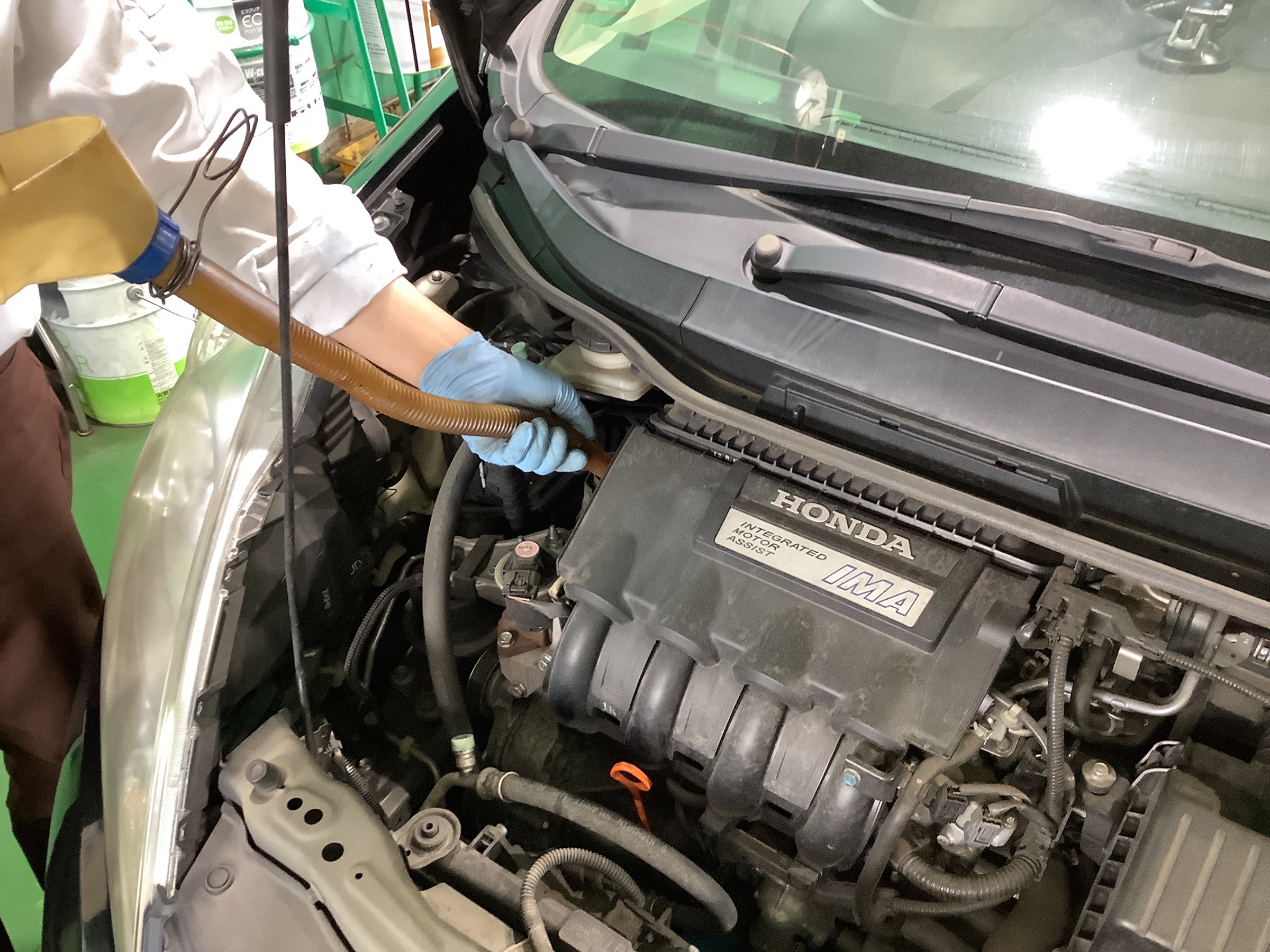 当店のエンジンオイル交換は専用の機械でオイルレベルゲージ部から上抜きします。