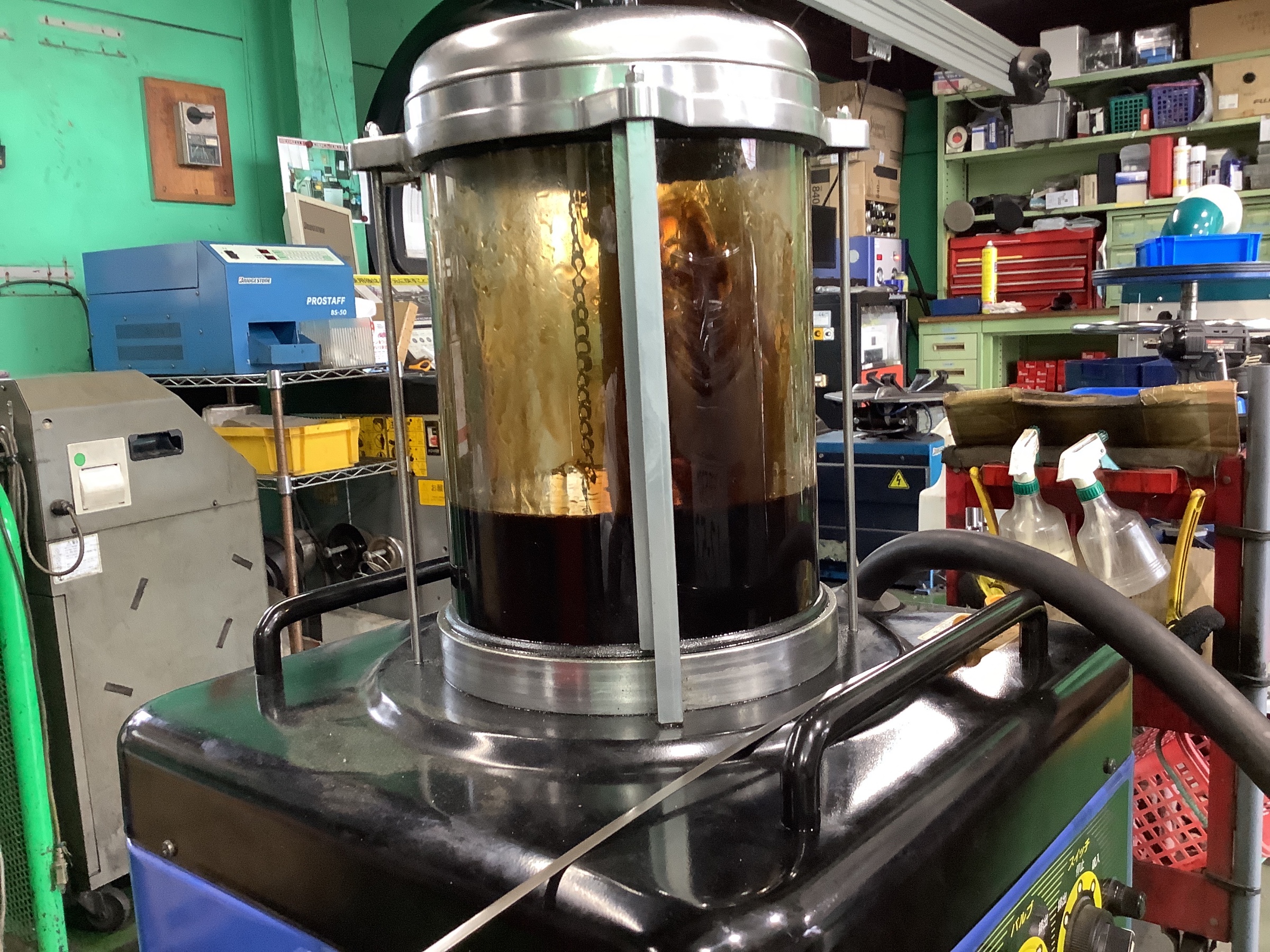 当店のエンジンオイル交換は専用の機械でオイルレベルゲージ部から上抜きします。
