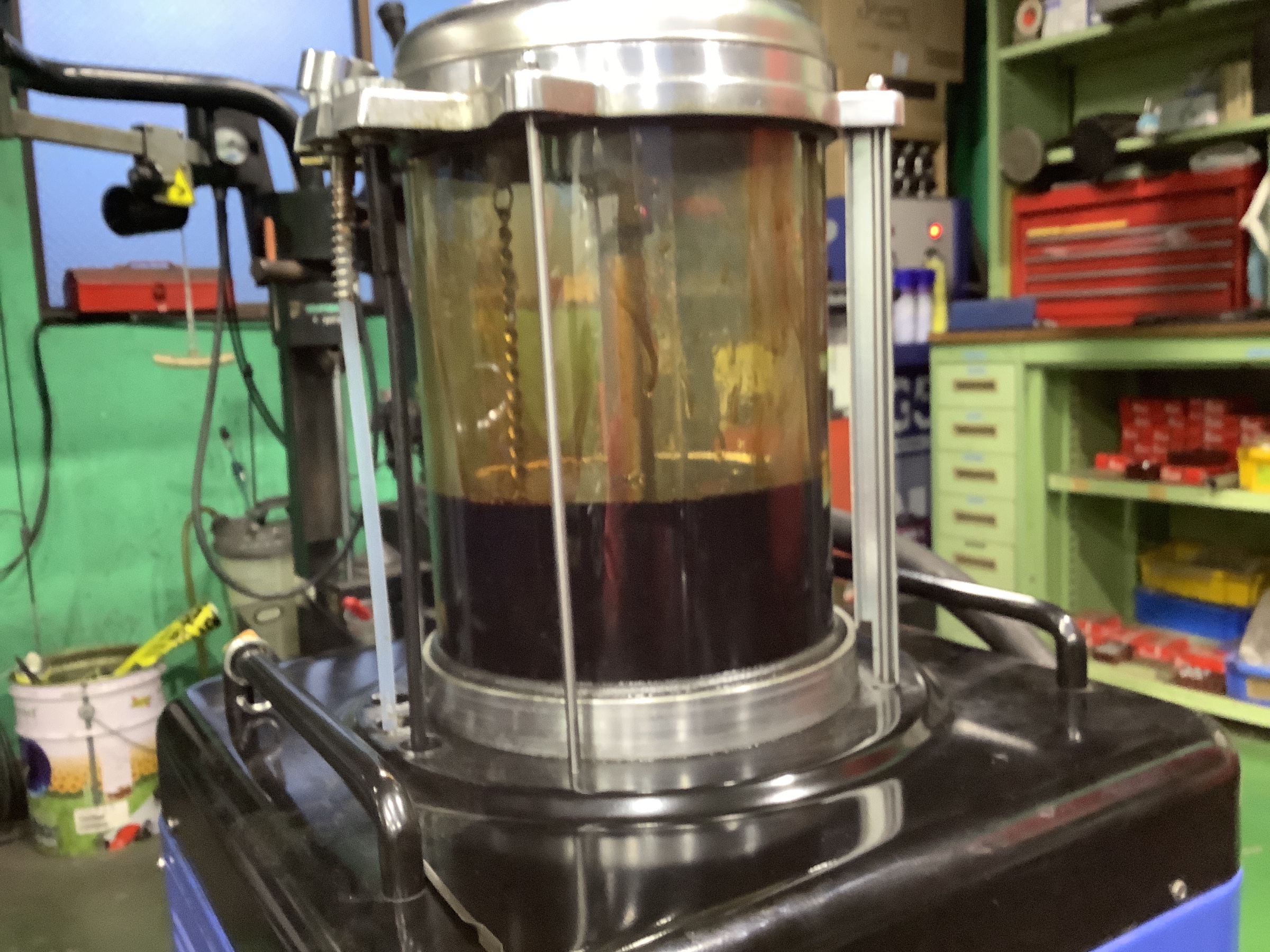 当店のエンジンオイル交換は専用の機械でオイルレベルゲージ部から上抜きします。