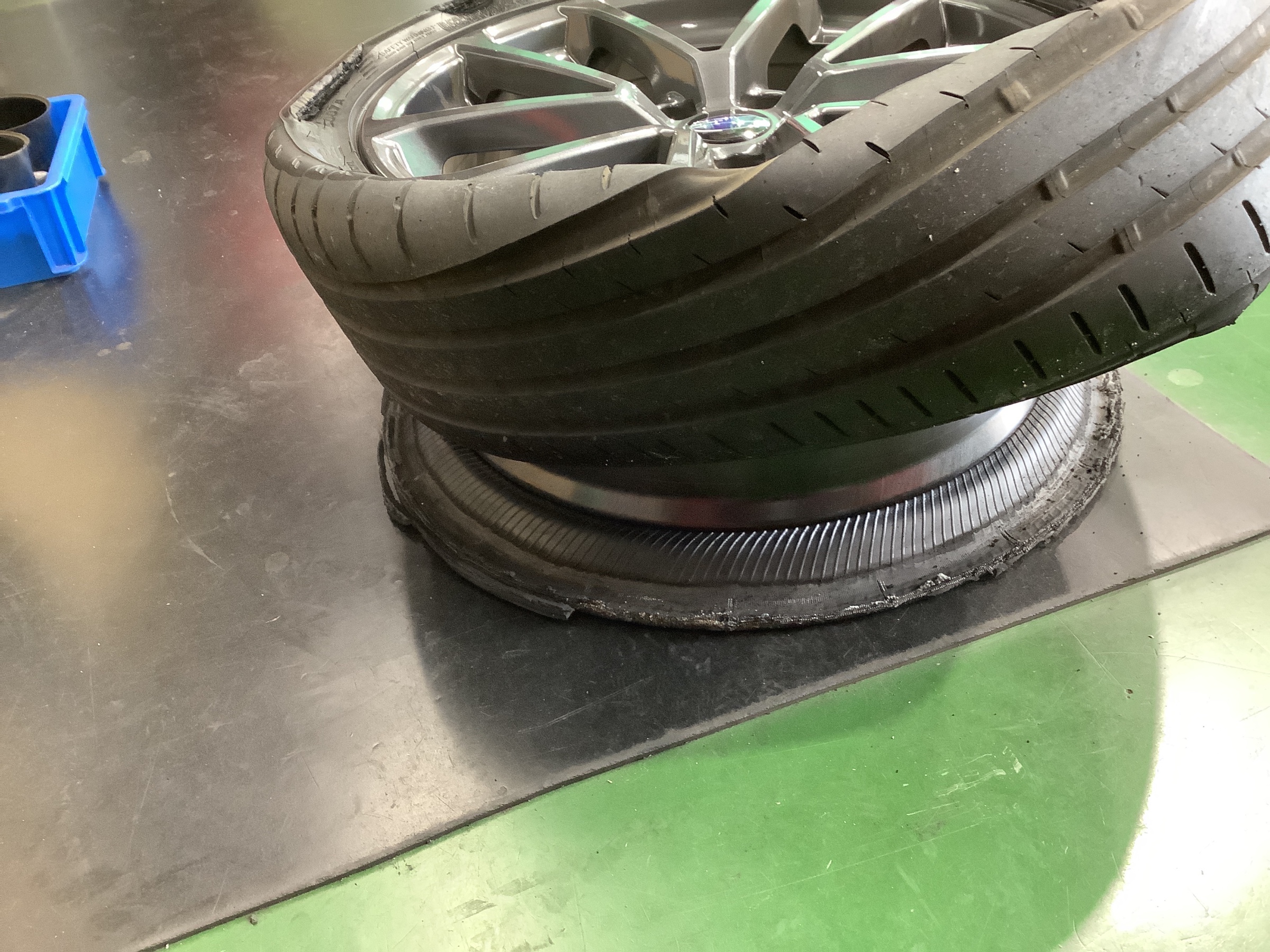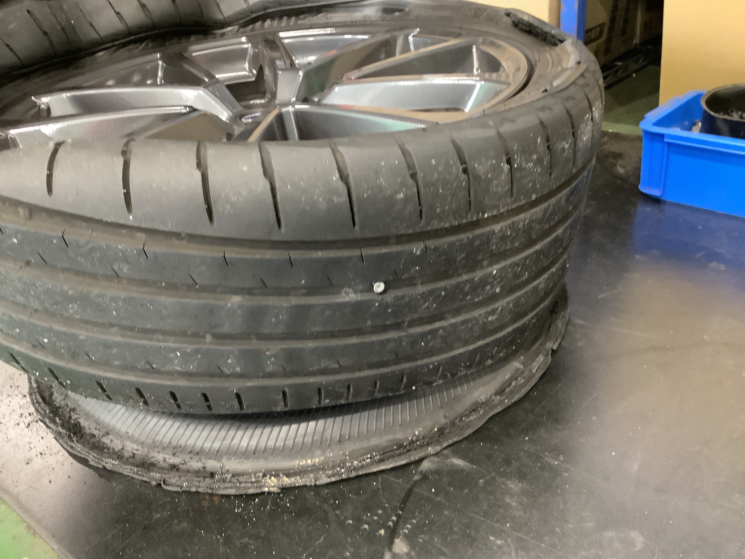 空気が抜けてしまい、そのまま走行したことでタイヤが外れてしまったようです(;゚Д゚)