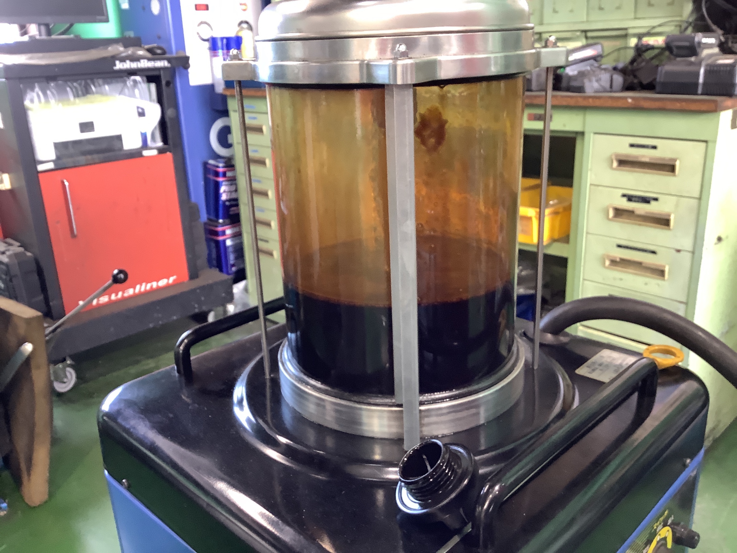当店のエンジンオイル交換は専用の機械でオイルレベルゲージ部から上抜きします。