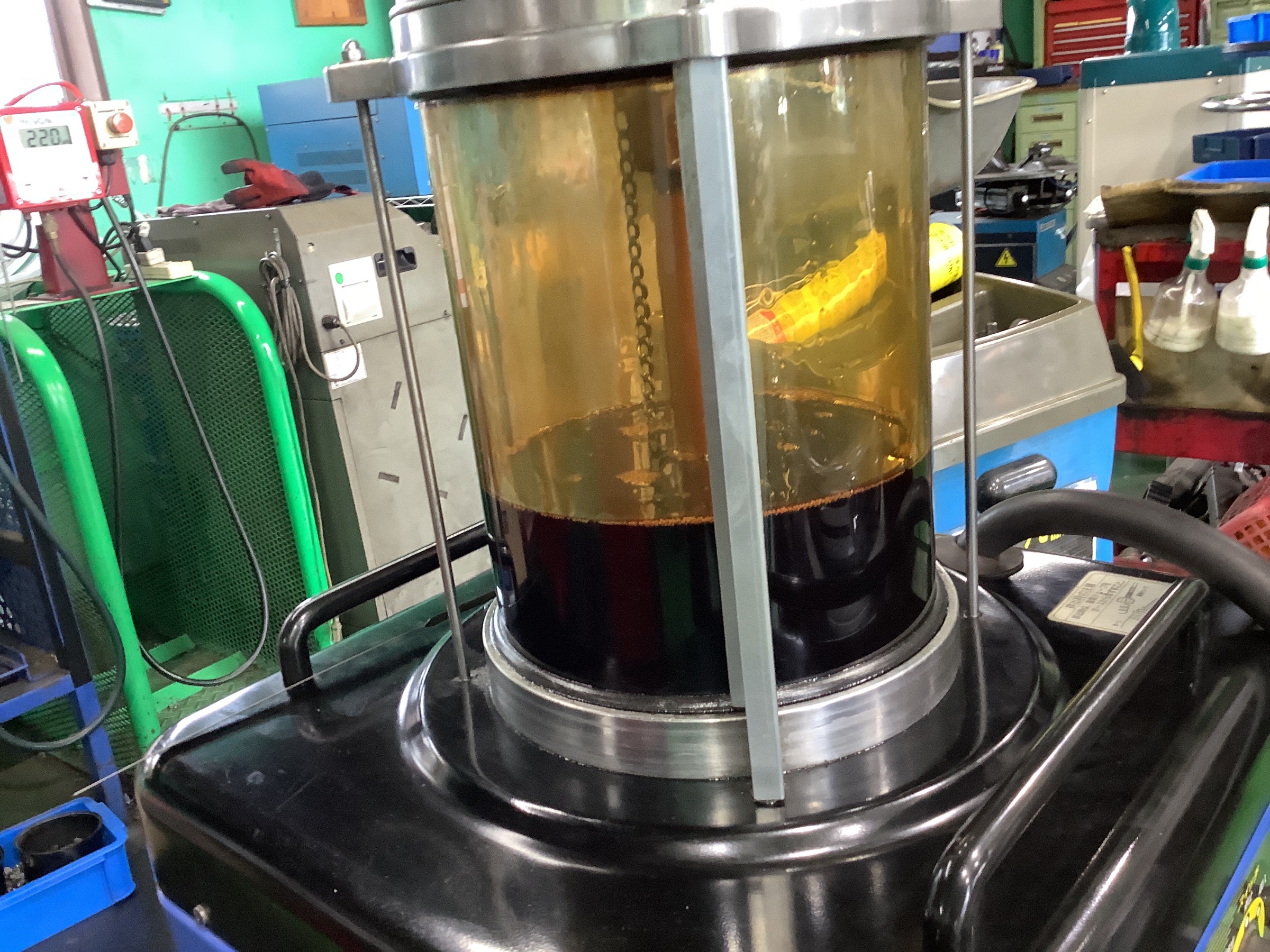 当店のエンジンオイル交換は専用の機械でオイルレベルゲージ部から上抜きします。