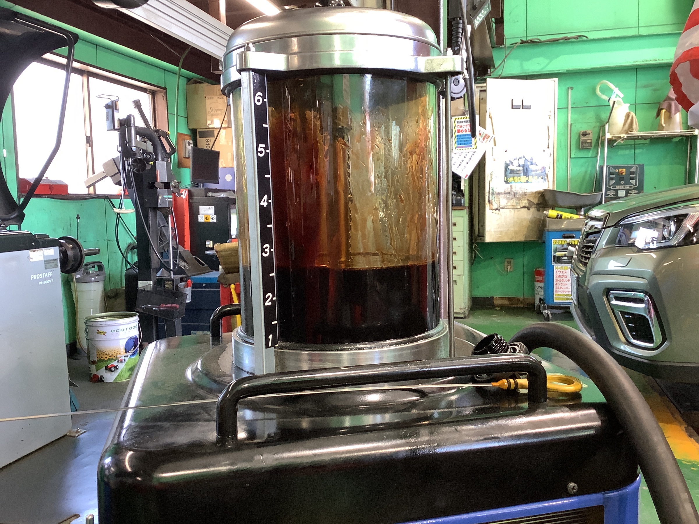 当店のエンジンオイル交換は専用の機械でオイルレベルゲージ部から上抜きします。