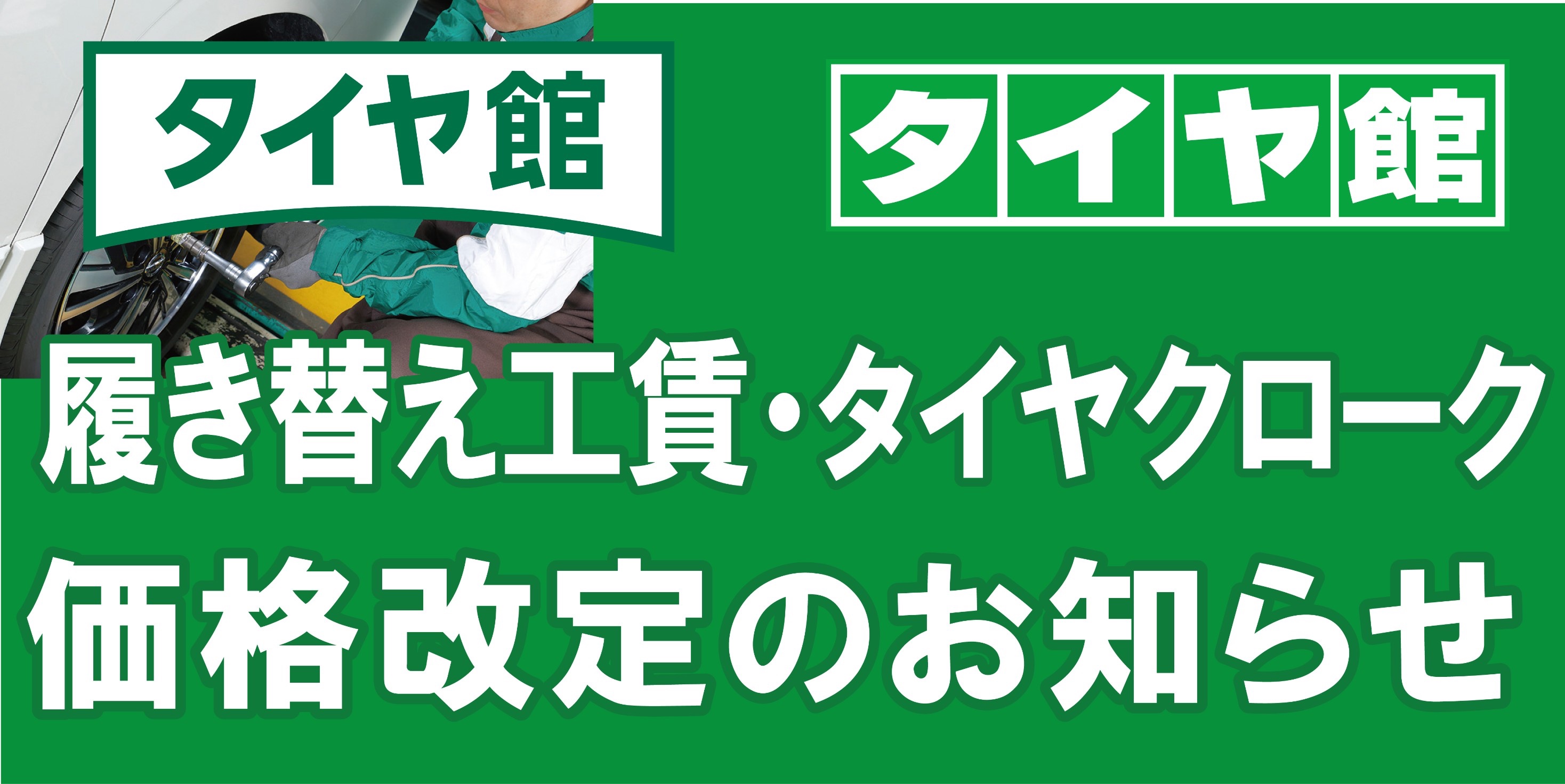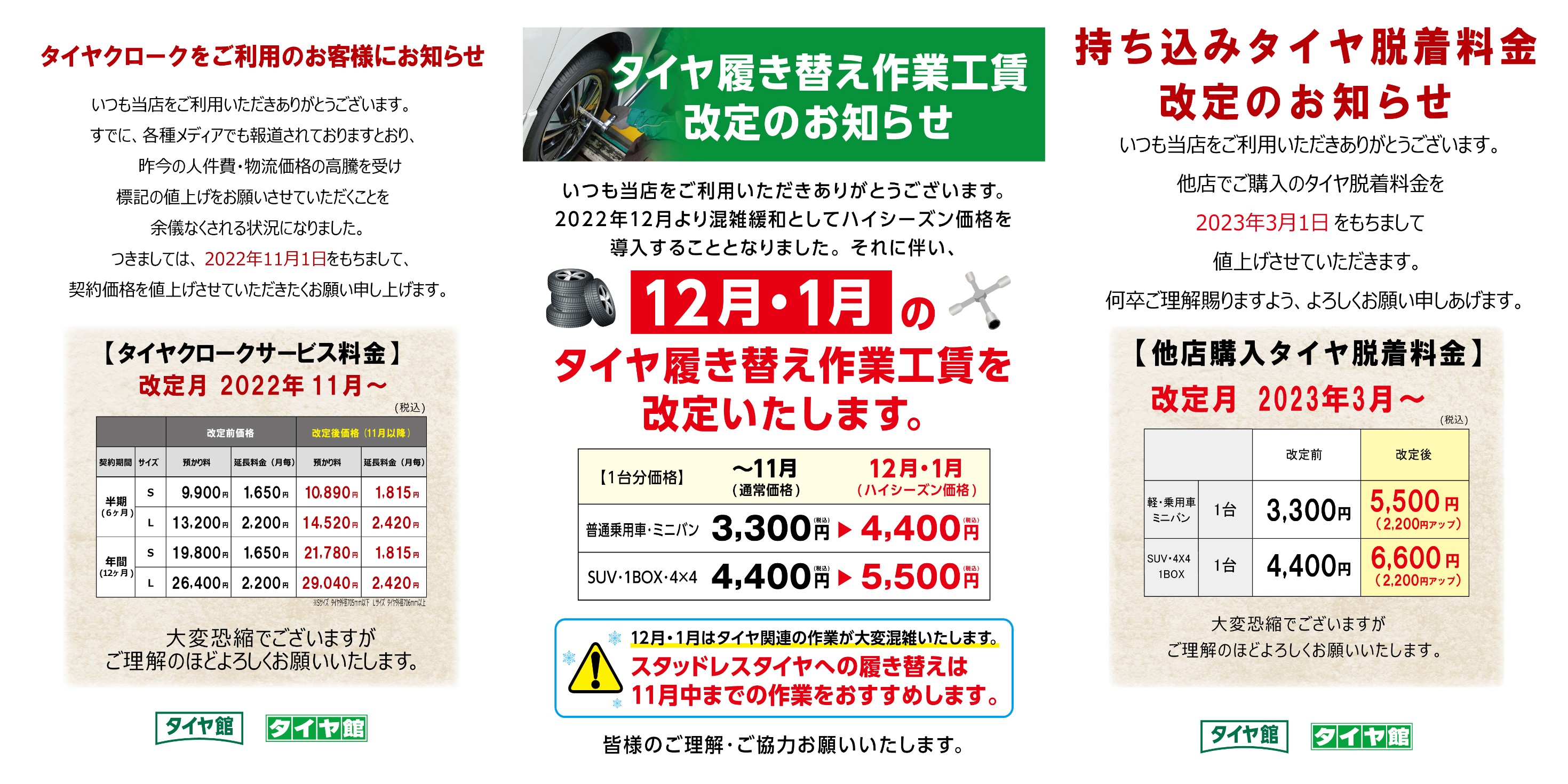 履き替え工賃・タイヤクローク価格改定のお知らせ ポスト 2022年9月30日 タイヤクローク 改定月 2022年11月1日~ Sサイズ 半期10,890円 年間14,520円 Lサイズ 半期21,780円 年間29,040円 タイヤ履き替え作業工賃ハイシーズン設定 改定月 2022年10月1日予約分より 12月・1月 タイヤ履き替え工賃 脱着1台分価格 軽・乗用車・ミニバン 4,400円 SUV・1BOX・4X4 5,500円 他店購入タイヤ履き替え作業工賃 改定月 2023年3月1日~ 脱着1台分価格 軽・乗用車・ミニバン 5,500円 SUV・1BOX・4X4 6,600円 ご理解の程、よろしくお願い致します。 カテゴリ:お知らせ