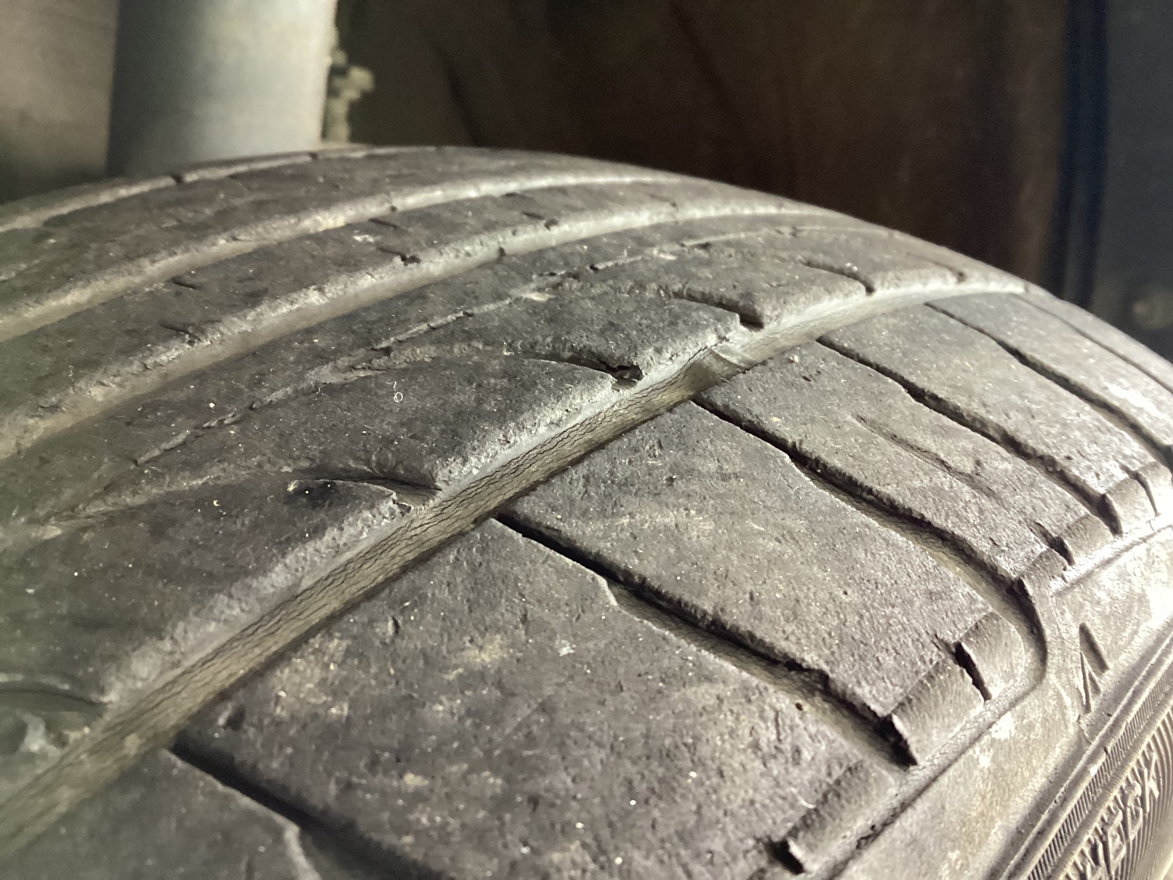 タイヤの溝にヒビ割れと、溝が少なくなっているのがわかりますか?