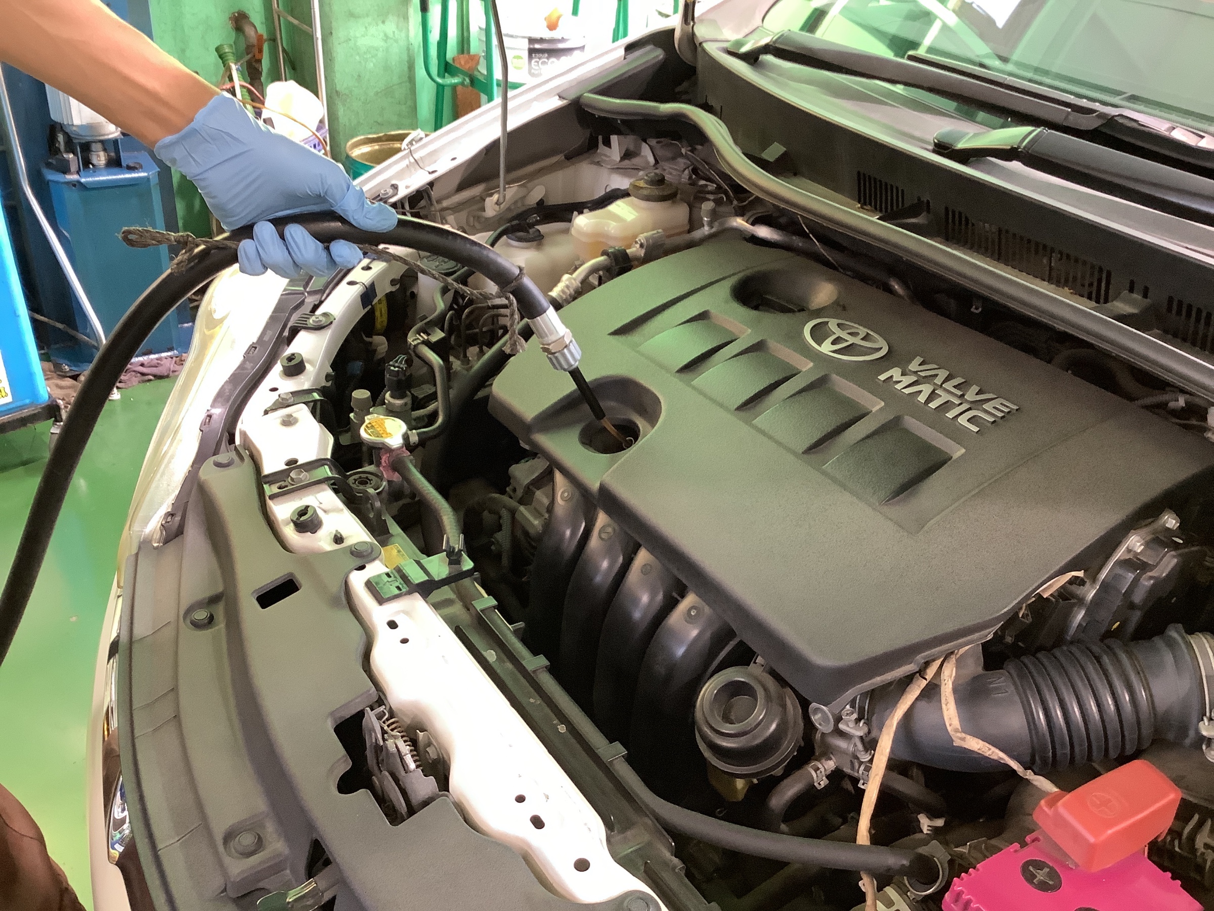 当店のエンジンオイル交換は専用の機械でオイルレベルゲージ部から上抜きします。