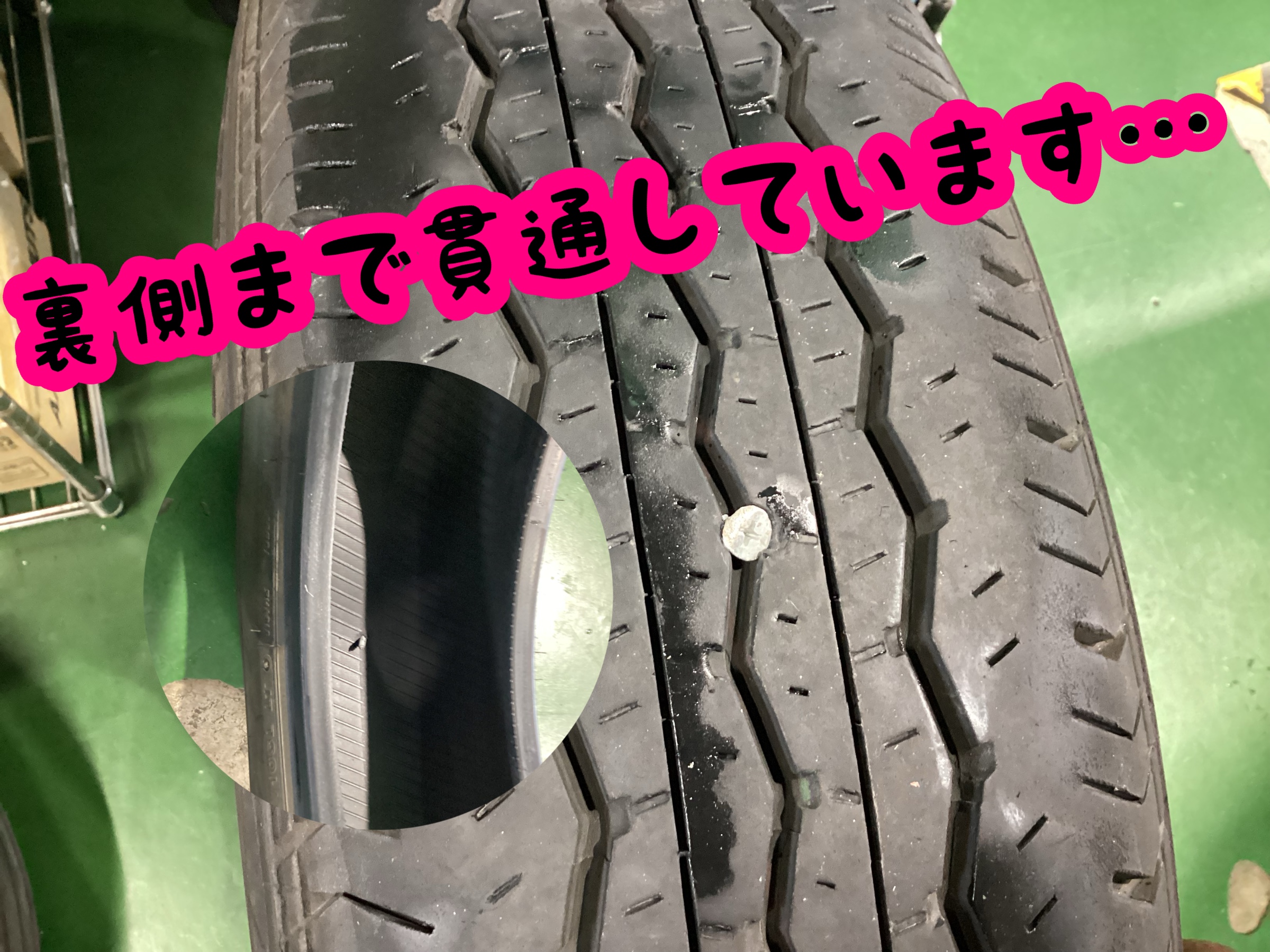 頭のつぶれたネジの様な物が刺さっています!タイヤの裏側を観るとガッツリ貫通しています。