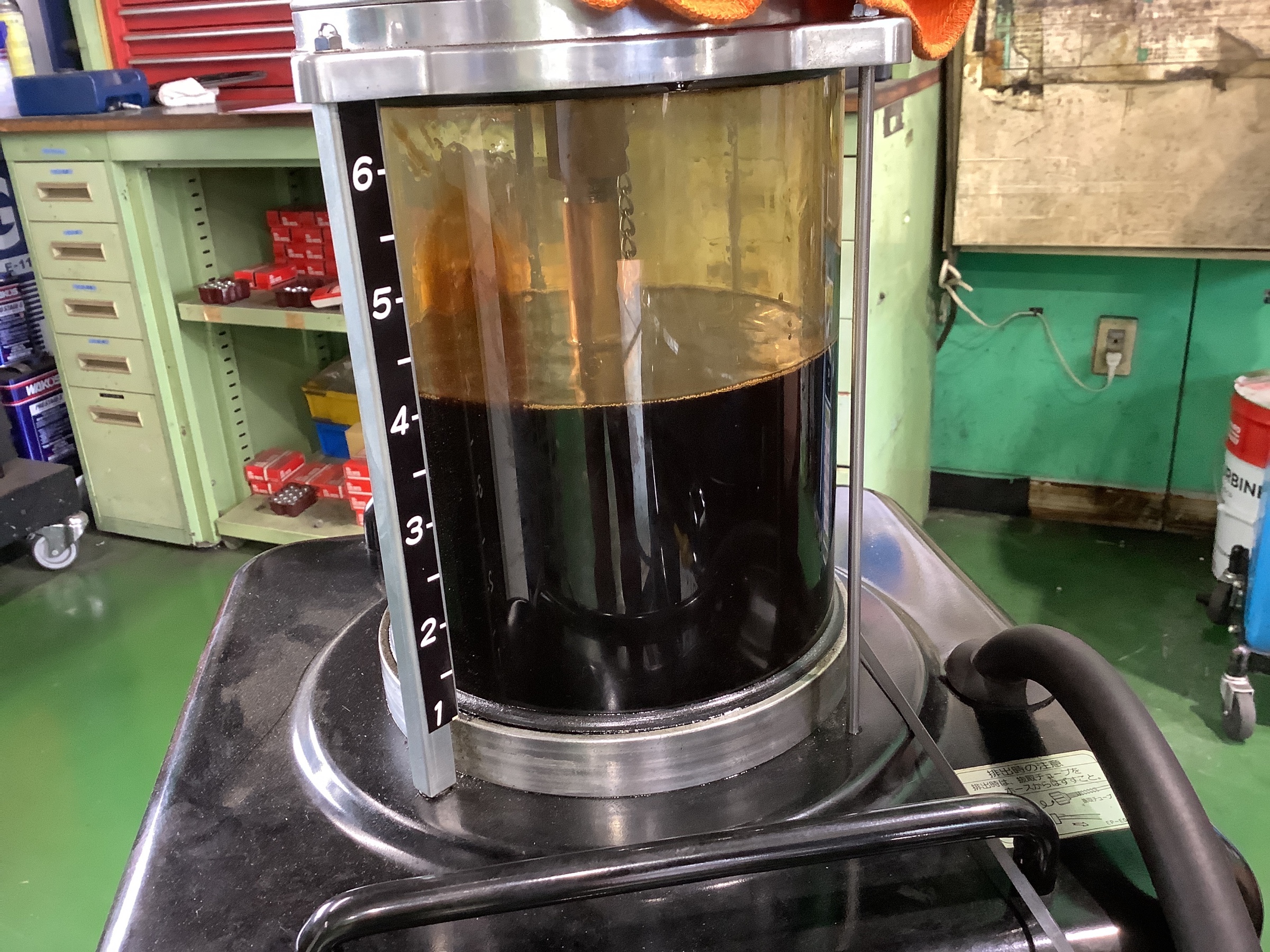 当店のエンジンオイル交換は専用の機械でオイルレベルゲージ部から上抜きします!