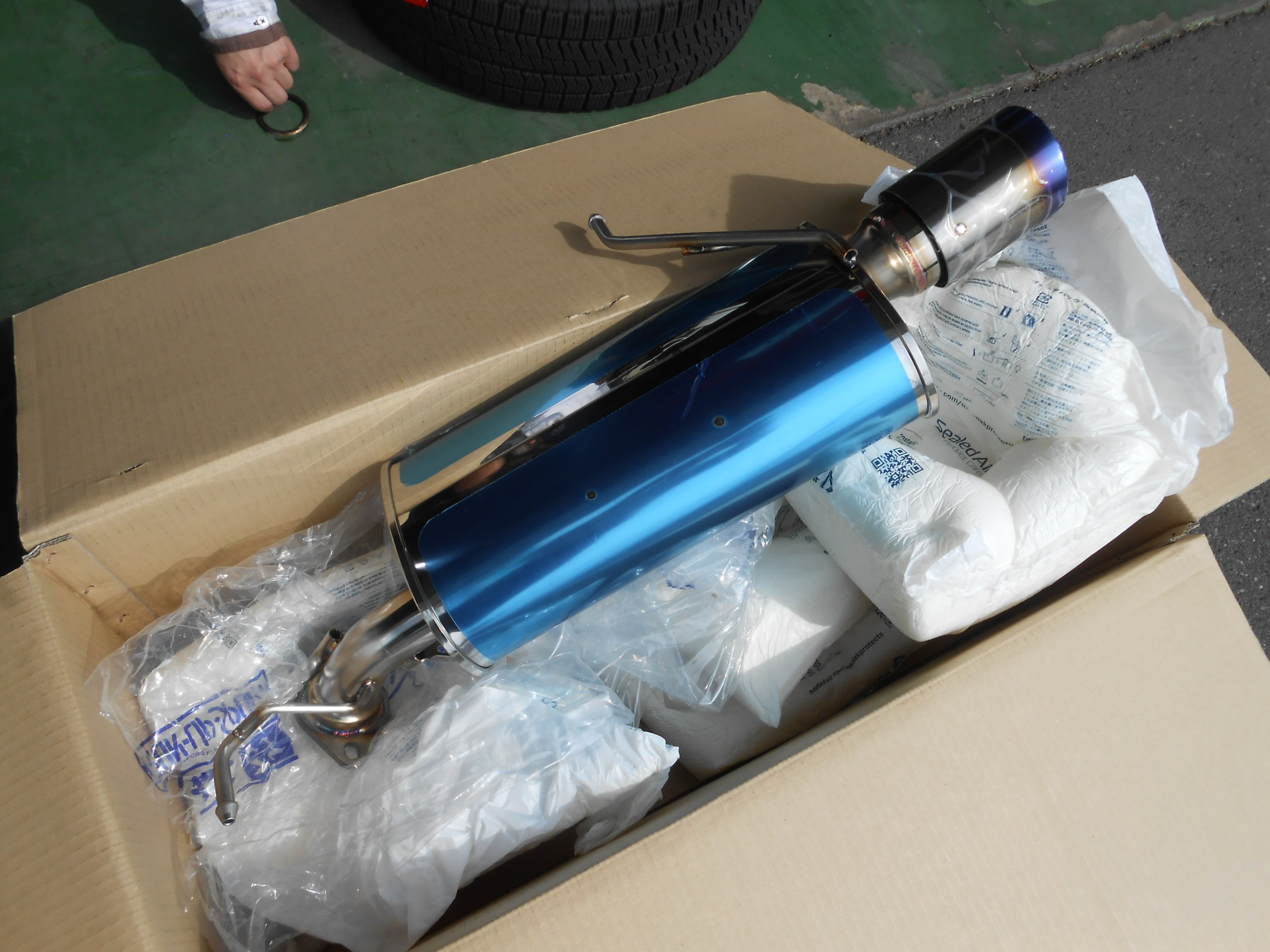 箱から新しいマフラーを取り出します。