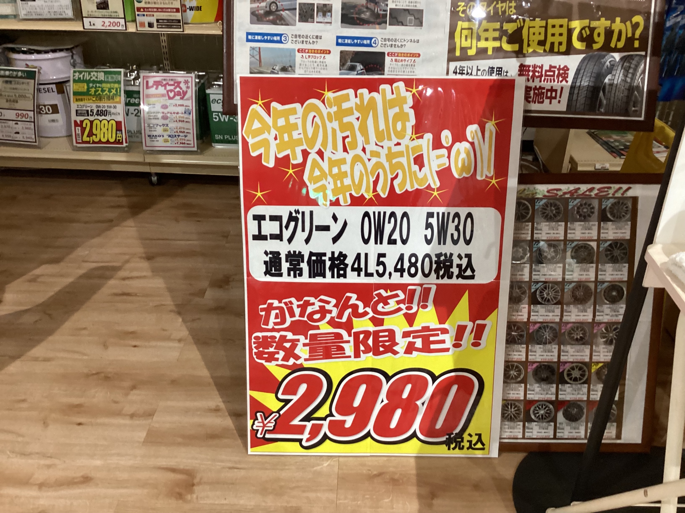 履き替えとご一緒にオイル交換しませんか? ポスト 2023年12月24日 こんにちは(^^) タイヤ館所沢店です( ^ω^ ) 今回はお買い得なエンジンオイルのご紹介です! 通常価格:5480円→2980円 オイル交換ならタイヤの履き替えと同時に出来るので追加のお待ち時間はほぼ変わりません!! この機会に是非当店にお立ち寄りください! 皆様のご来店心よりお待ちしております。