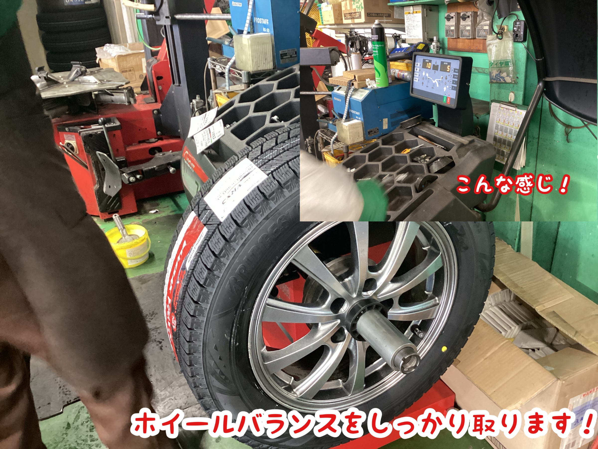 ホイールバランサーを用いてホイールバランスを取ります。