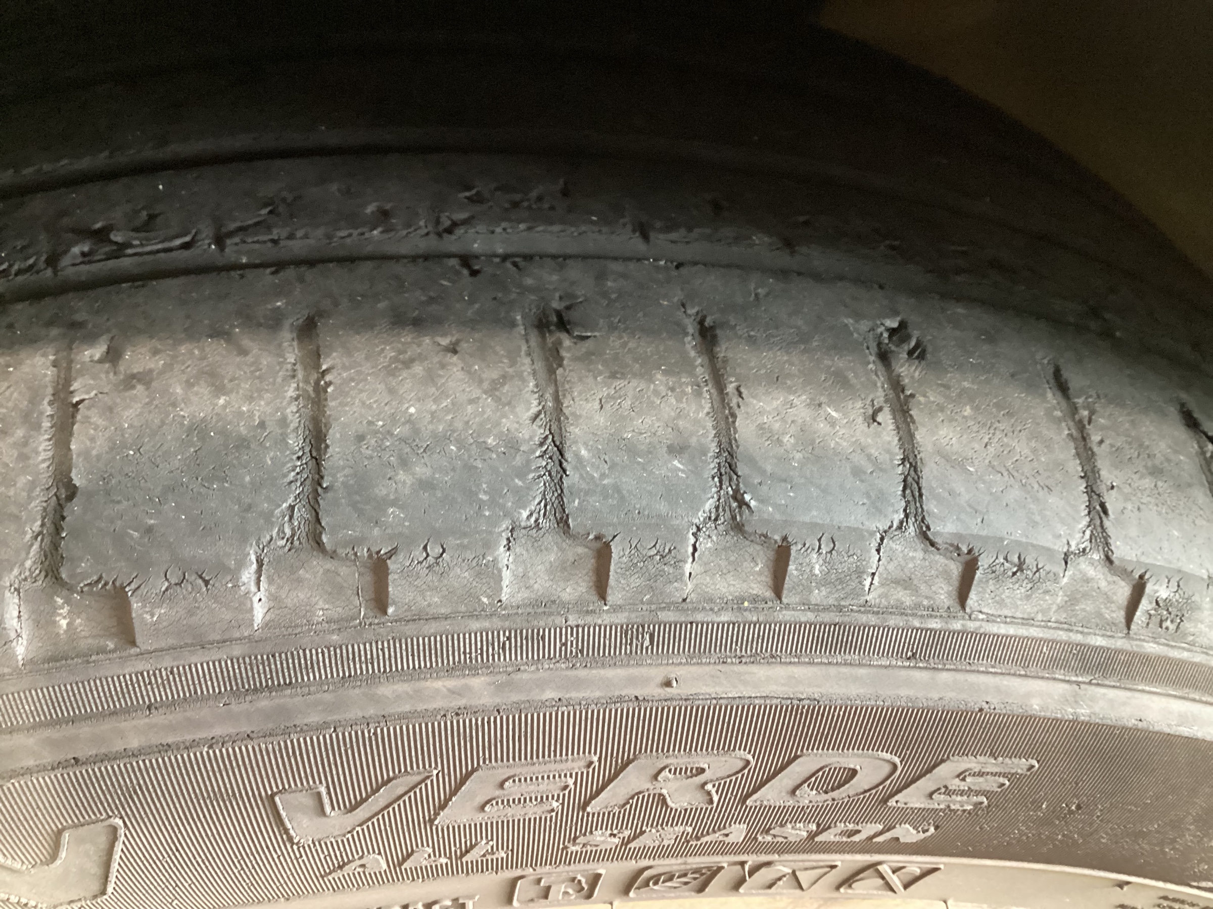 ↑ご使用だったタイヤは走行面にも多くのヒビ割れが見られ残溝も少なくスリップサイン露出までも