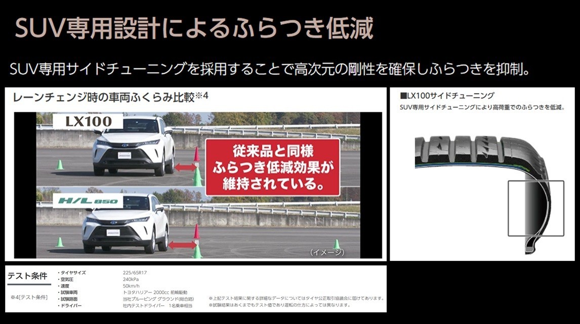 ただ、ブリヂストンにはすでにSUV専用タイヤで静粛性、乗り心地に優れた『ALENZA・LX100(アレンザ・レルエックスヒャク)』がございます。