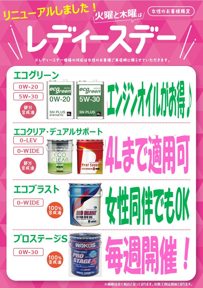 ・レディースデーではエンジンオイルがお得に交換できちゃいます♪