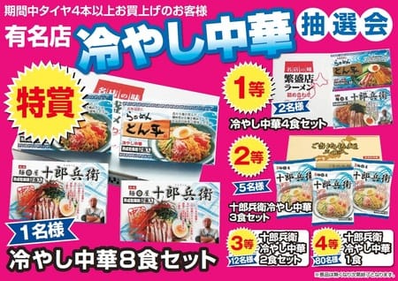 【「ちゃんと買い」。集中得市】開催!! ポスト 2016年8月7日 8/6(土)~8/21(日)の期間【お出かけ前はタイヤ館へGO!「ちゃんと買い」。集中得市】を開催中です。タイヤ4本お買上げで、【有名店 冷やし中華 抽選会】をやっています。お買得品もご用意しておりますので、お盆のお出かけ前に是非、タイヤ館にお立ち寄り下さい。タイヤ交換なら、タイヤ館所沢へ!! ご来店お待ちしております。 担当:齋藤